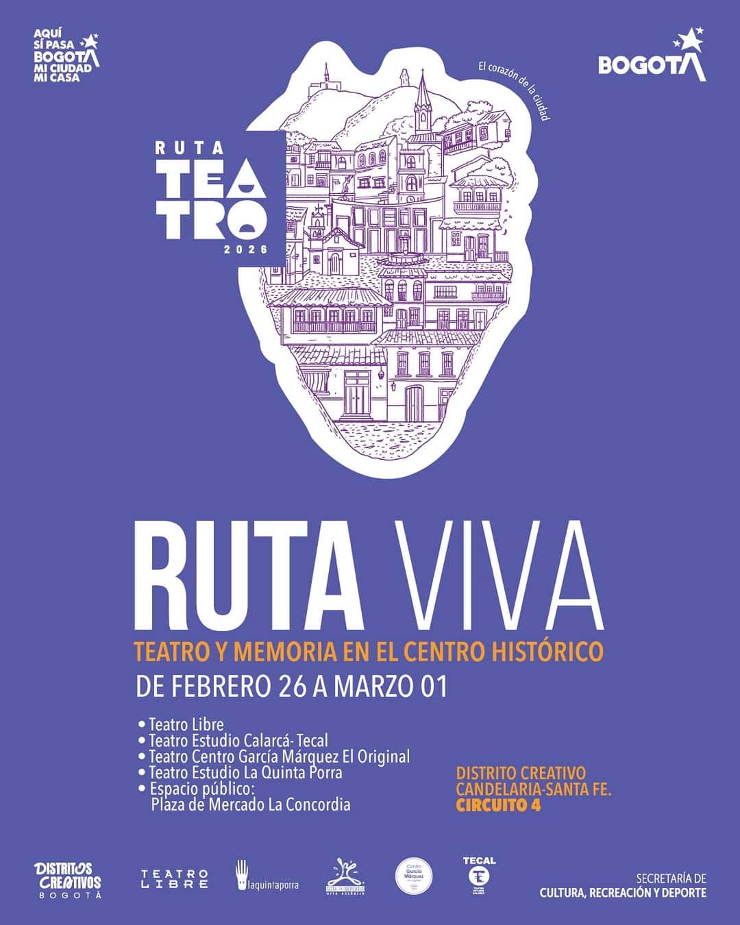 Descubre el corazón de la ciudad de Bogotá a través de la RUTA VIVA – Ruta Teatro 2026. Este recorrido te llevará por el teatro independiente de La Candelaria, un lugar donde la memoria, la ciudad y la creación escénica se encuentran. Organizado por los Distritos Creativos Bogotá y la Secretaría de Cultura, Recreación y Deporte, este evento te permitirá vivir el teatro en lugares como el Teatro Libre, Teatro Estudio Calarcá-Tecal, Teatro Centro García Márquez El Original, Teatro Estudio La Quinta Porra y la Plaza de Mercado La Concordia. No te pierdas esta experiencia única en el Distrito Creativo Candelaria-Santa Fe, Circuito 4.