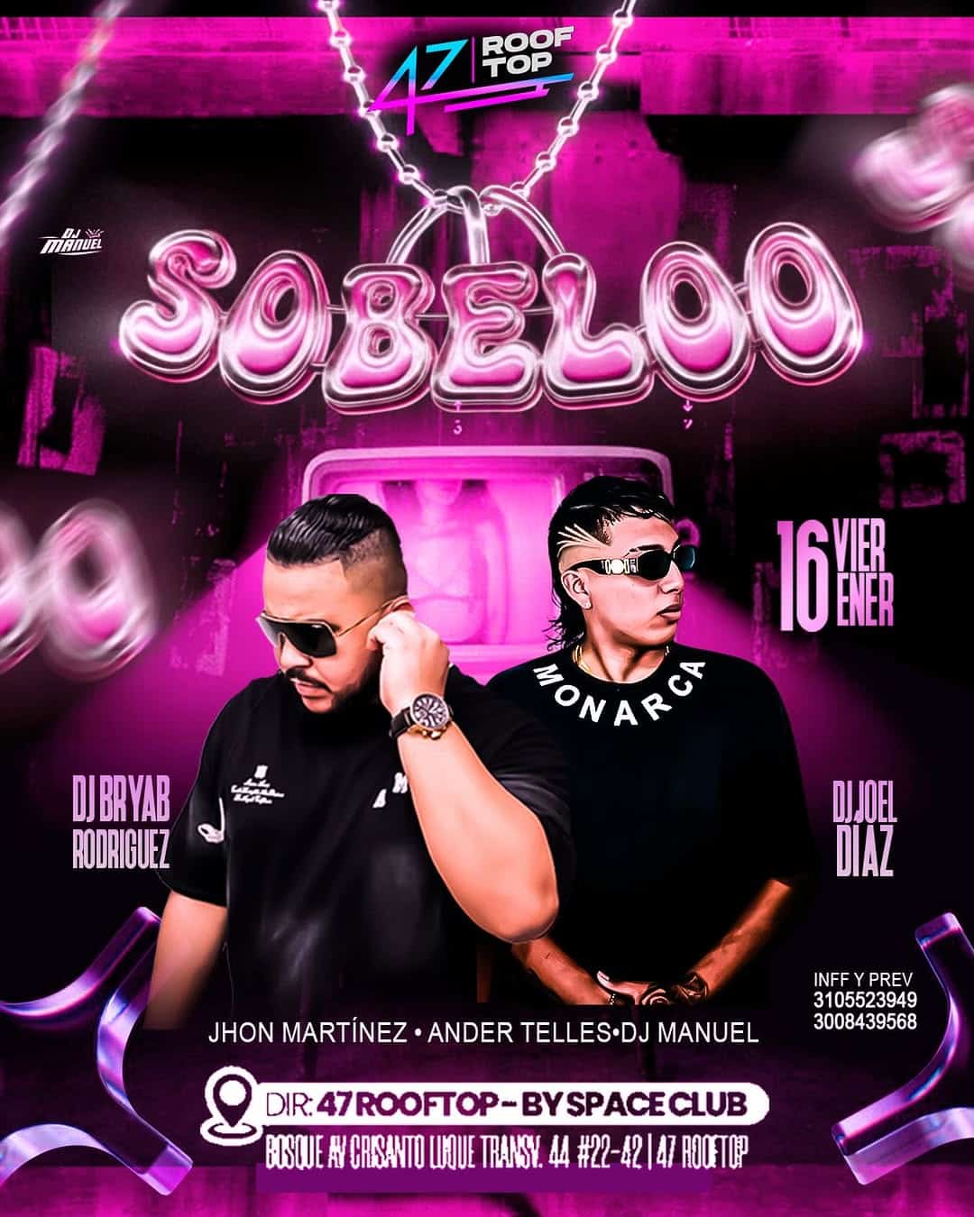 Este viernes 16 de enero, prepárate para vivir una noche inolvidable en el 47 Rooftop – By Space Club. Disfruta de la mejor música a cargo de DJ Joel Diaz, DJ Bryan Rodriguez, DJ Jhon Martinez y DJ Ander Telles. No te pierdas esta gran fiesta en la ciudad, donde la diversión y la buena música están garantizadas.