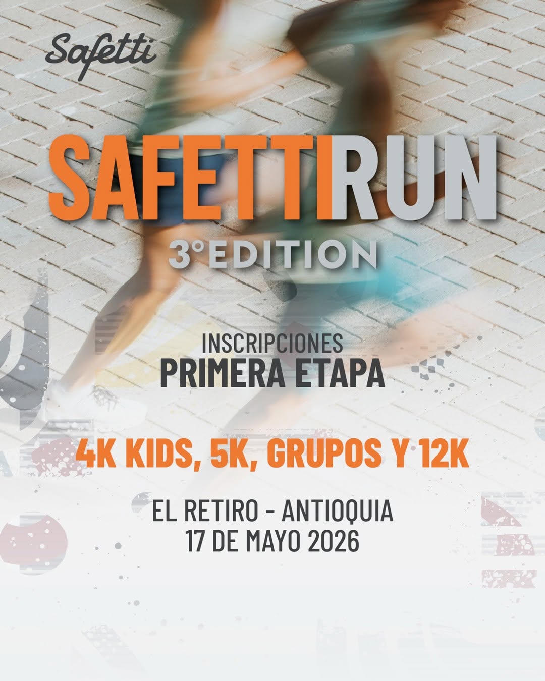 SAFETTIRUN 3° Edition es una carrera recreativa y competitiva en El Retiro, Antioquia, organizada por Safetti. Ofrece recorridos de 4K para niños, 5K desde los 13 años y 12K para quienes buscan un reto mayor. Es una experiencia deportiva al aire libre ideal para familias, grupos y corredores aficionados que quieran disfrutar una jornada de running en Antioquia, con inscripción online previa.