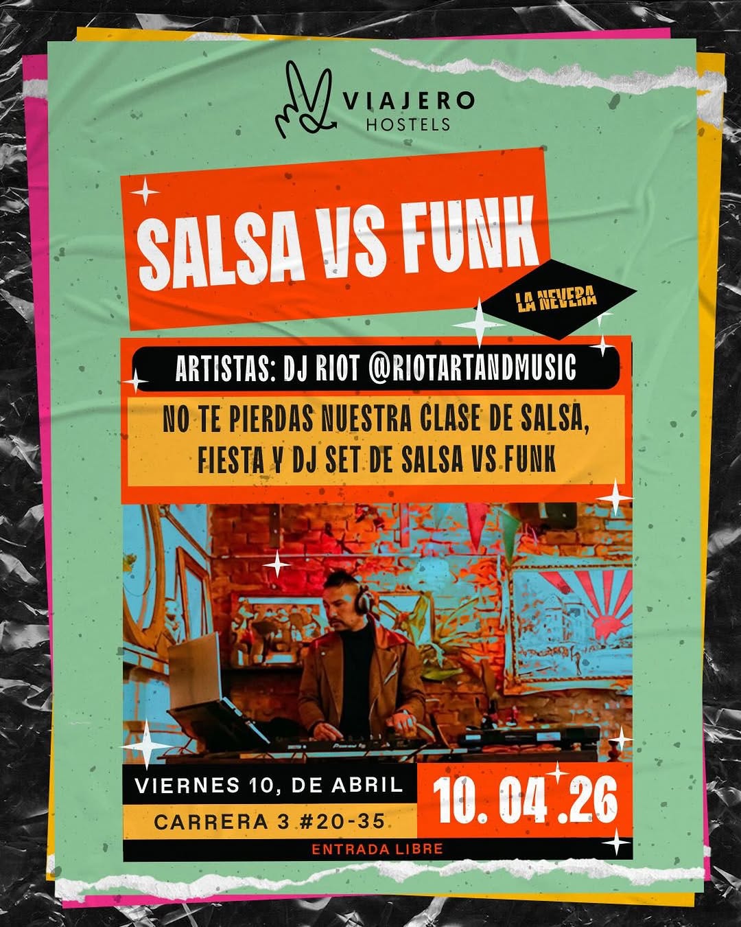 SALSA VS FUNK es la noche de baile y fiesta de Viajero Bogotá en la que se combinan clase de salsa, DJ set y rumba temática en la ciudad. El plan incluye intercambio de idiomas, una clase guiada por Juancho Salsita y luego una fiesta donde DJ Riot mezcla salsa y funk para mantener la pista encendida. Ideal para quienes quieren aprender, practicar y disfrutar ritmos latinos y funk en un ambiente viajero y multicultural.