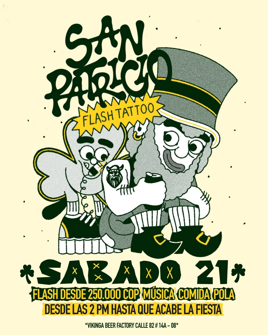 SAN PATRICIO FLASH TATTOO es una jornada especial de flash tattoos y fiesta en Vikinga Beer Factory, con música en vivo, comida y cerveza artesanal en Bogotá. Más de diez tatuadores ofrecerán diseños rápidos en distintos estilos, además de perforaciones, en un ambiente cervecero ideal para celebrar San Patricio. La noche cierra con DJ set para quienes quieran seguir la rumba entre amigos, tatuajes y buena pola.