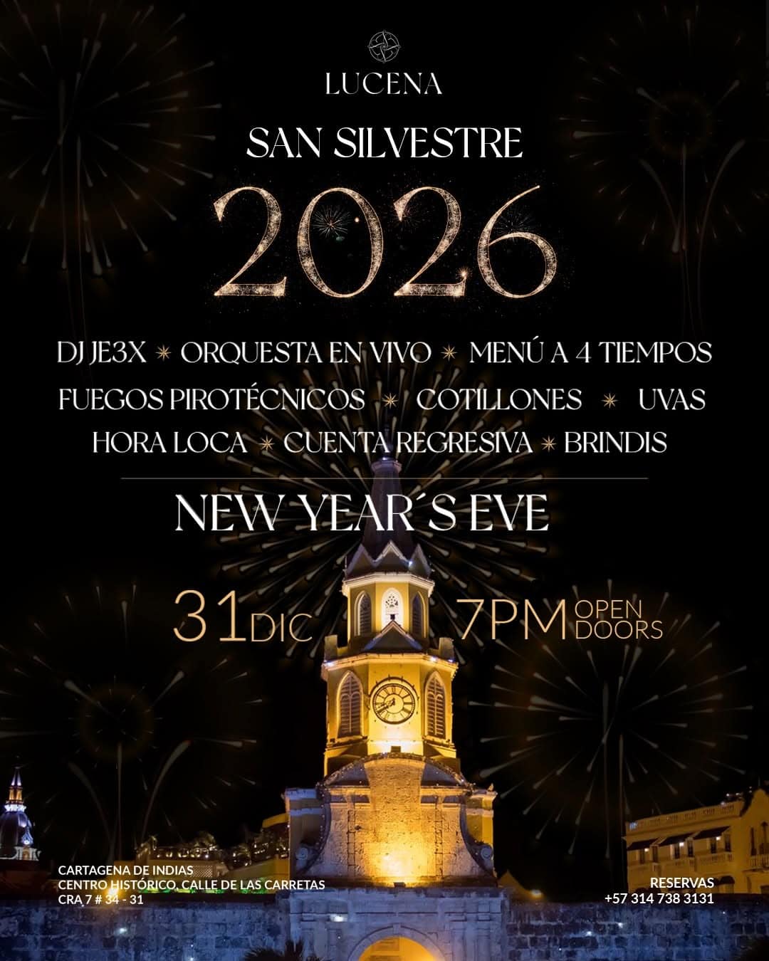 Despide el año desde lo más alto en la celebración de San Silvestre 2025 en Lucena Rooftop, Cartagena. Disfruta de una noche diseñada para celebrar con DJ JE3X y una orquesta en vivo. La experiencia incluye un menú de 4 tiempos, fuegos pirotécnicos, cotillones, uvas, hora loca, cuenta regresiva y brindis. No te pierdas esta noche mágica y comienza el nuevo año con estilo.