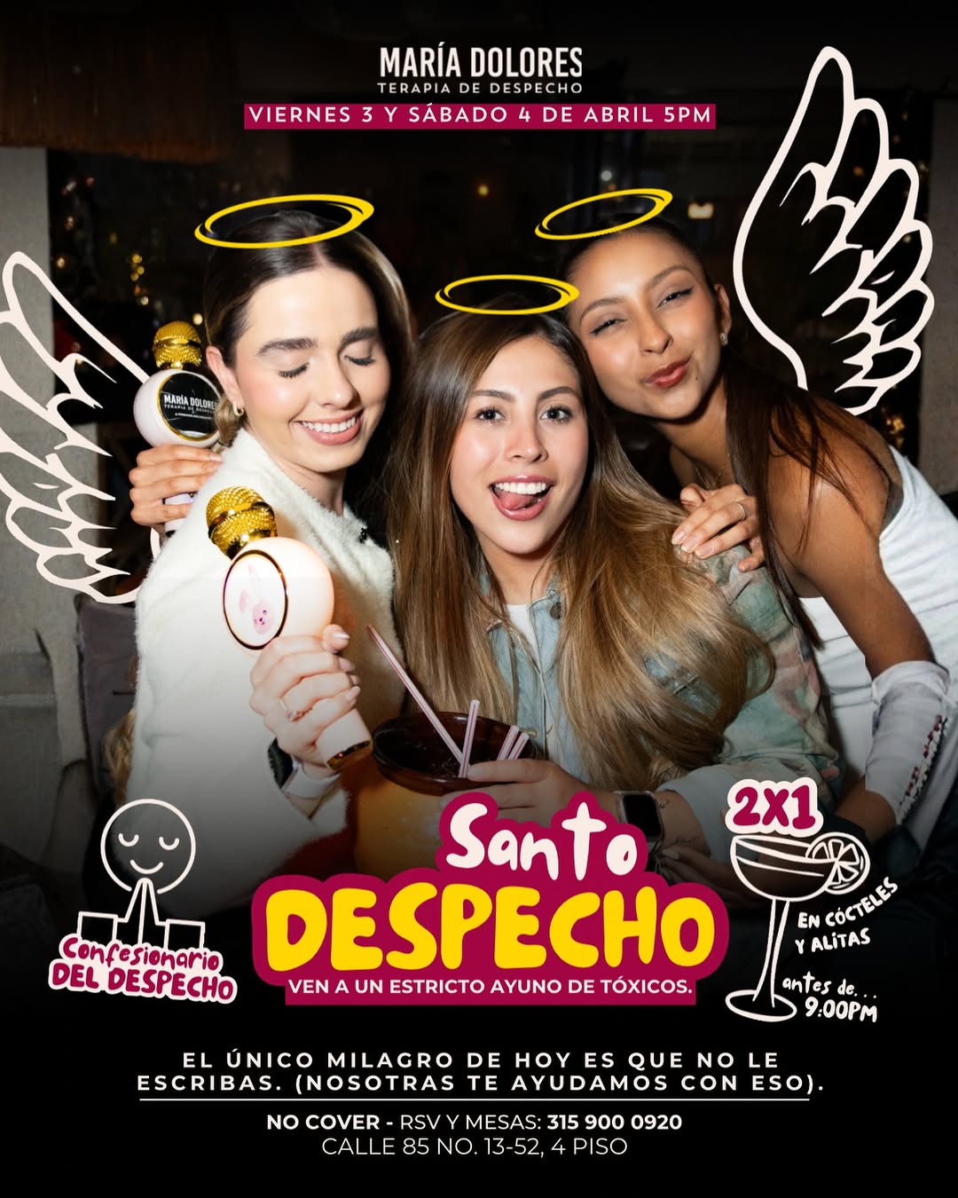 Santo Despecho es una terapia de despecho en la terraza de María Dolores en Bogotá, ideal para quienes quieren cantar a todo pulmón y dejar atrás a los amores tóxicos. El plan incluye un confesionario donde los asistentes comparten sus pecados amorosos para ganar shots de absolución, además de promociones en cocteles y alitas. Un plan perfecto de Semana Santa para desahogarse entre amigos en un ambiente fiestero y descomplicado.