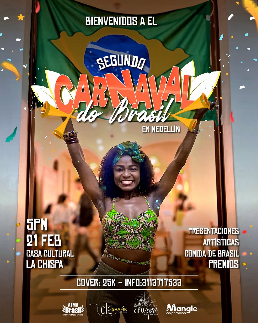 El Segundo Carnaval do Brasil en Medellín es una celebración cultural que reúne presentaciones artísticas, ritmos y sabores típicos de Brasil en Casa Cultural La Chispa, en Medellín. Este carnaval ofrece shows en vivo, ambiente festivo, comida brasileña y actividades con premios para el público. Es una oportunidad para disfrutar un carnaval brasileño auténtico en la ciudad, organizado por colectivos culturales especializados en cultura brasilera.