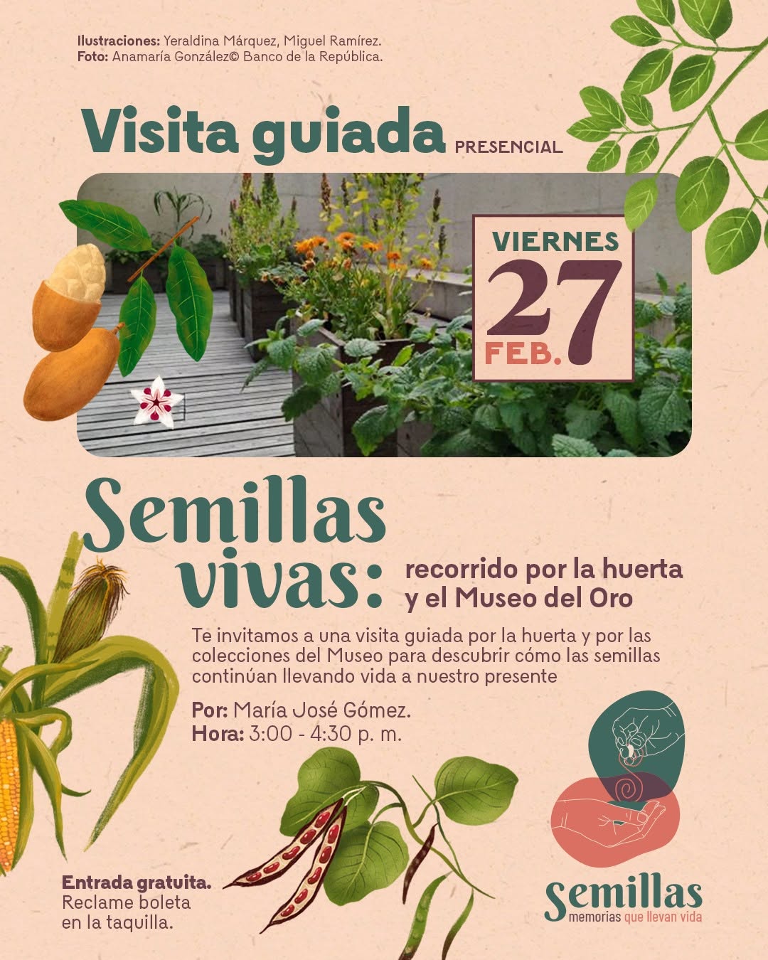 “Semillas vivas: recorrido por la huerta y el Museo del Oro” es una visita guiada presencial en el Museo del Oro en Bogotá, donde explorarás la huerta y las colecciones del museo para comprender la relación entre semillas, memoria y vida en el presente. A partir de prácticas agrícolas prehispánicas y saberes ancestrales, el recorrido invita a reflexionar sobre sostenibilidad, espiritualidad y naturaleza en un espacio de aprendizaje colectivo.