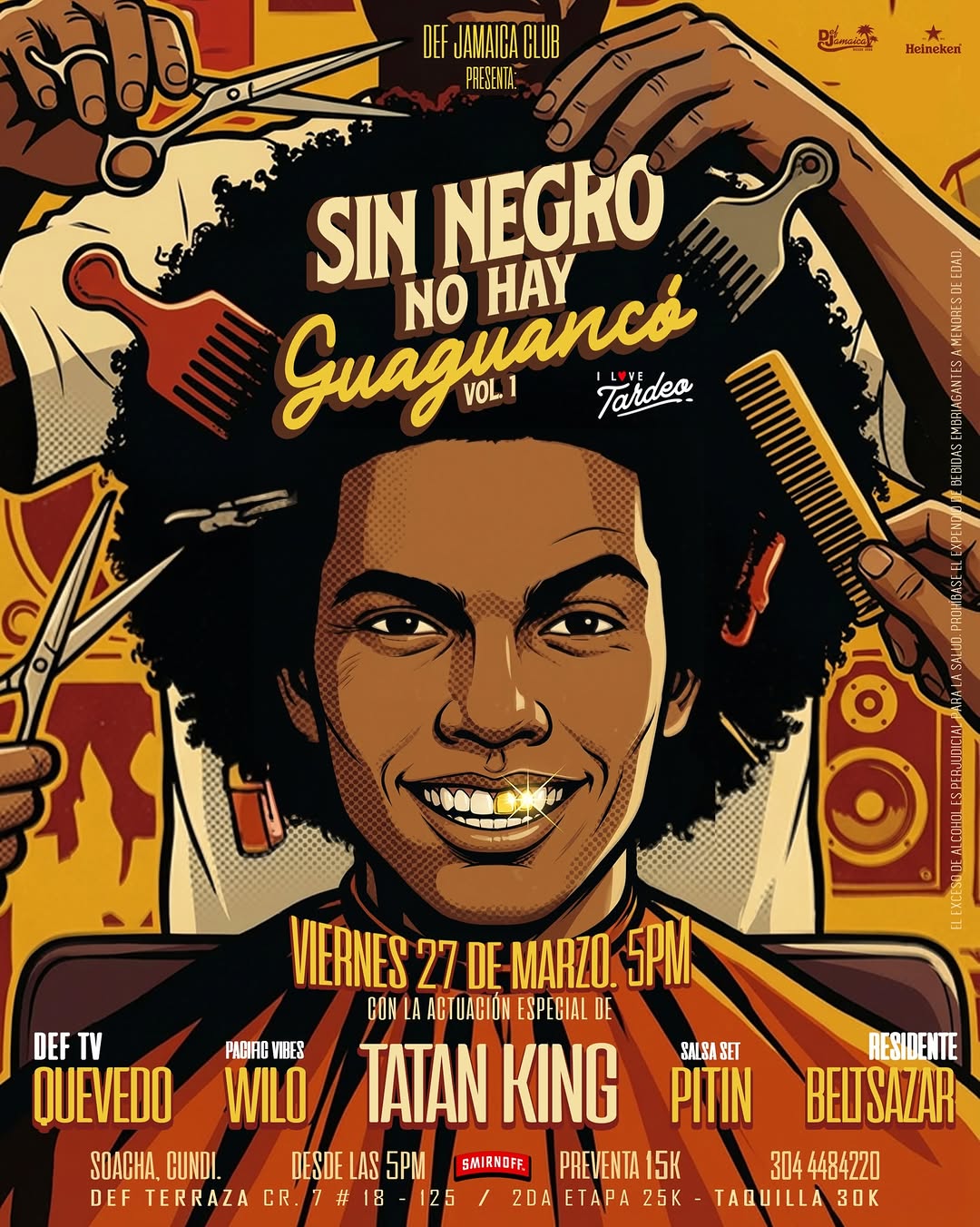 SIN NEGRO NO HAY Guaguancó VOL.1 es una fiesta cultural en formato tardeo que celebra la salsa, la herencia afro y los ritmos del Pacífico en Soacha. En este evento de DJ set y clubbing, con artistas como Tatan King, Quevedo, Wilo, Pitin y el residente Beltsazar, se mezclan salsa, afro, dancehall y chirimía en una noche de resistencia, baile y corrinche, organizada por Off Jamaica Club en Soacha, cerca de Bogotá.