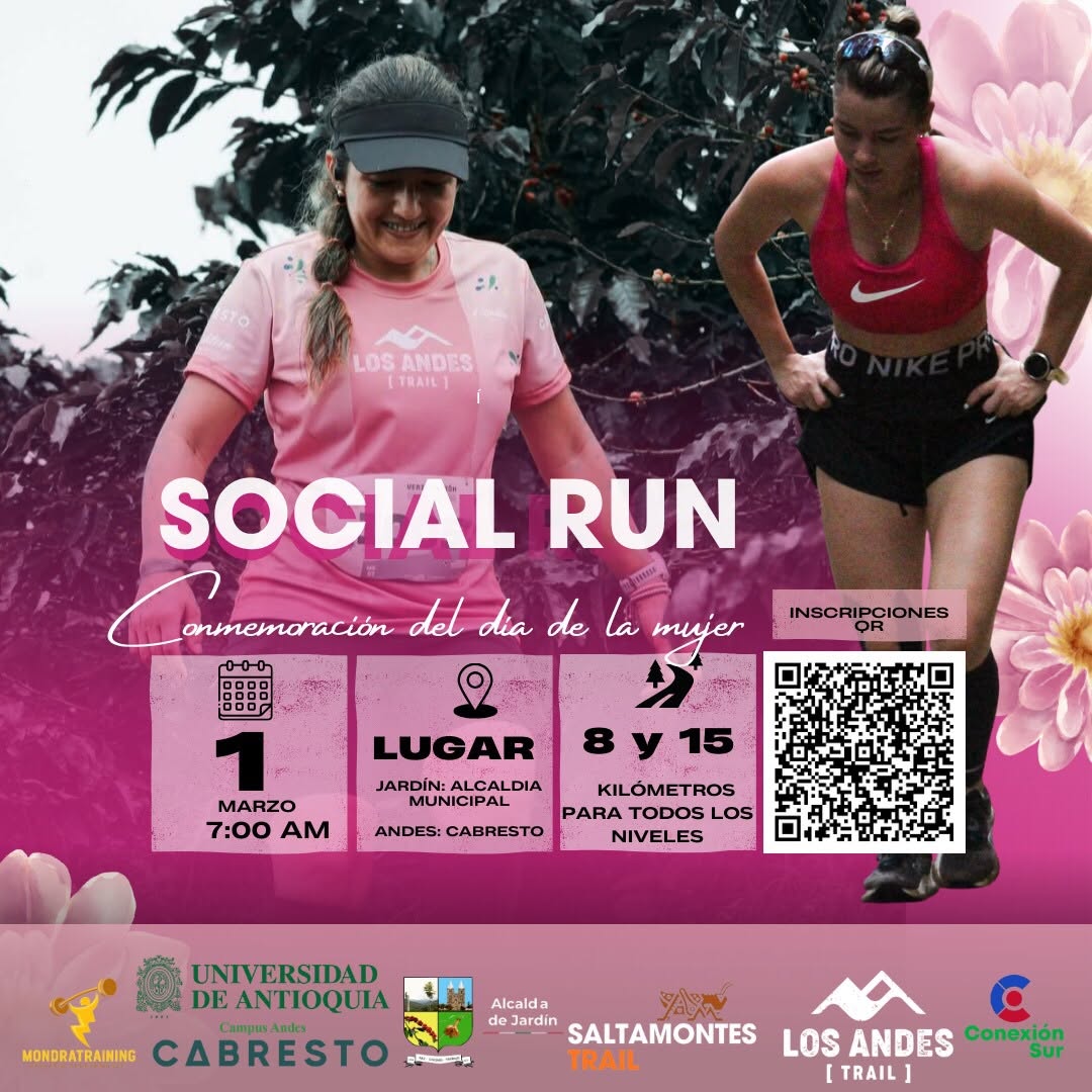 Social Run es una carrera de trail y encuentro comunitario en homenaje al Día de la Mujer, con recorridos de 8 y 15 kilómetros aptos para diferentes niveles. Organizado por la comunidad de running en Jardín y Andes, Antioquia, este evento deportivo invita a correr en grupo, compartir territorio y resaltar la fuerza y alegría de las mujeres en cada kilómetro.