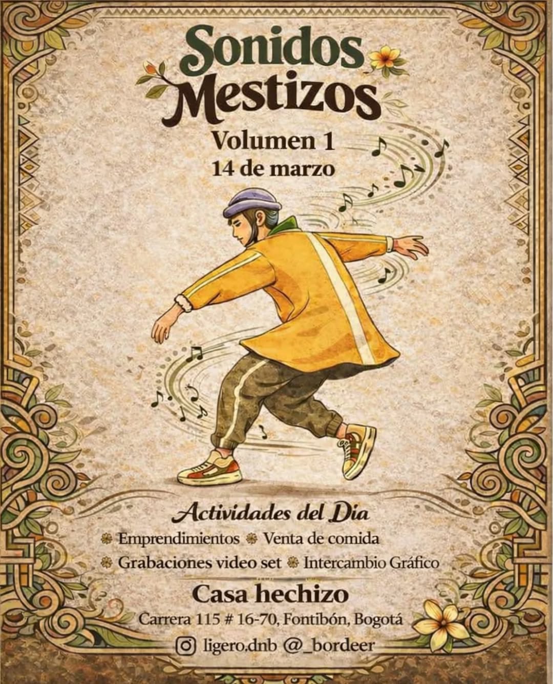 Sonidos Mestizos Volumen 1 llega a Casa hechizo en Fontibón, Bogotá, como un encuentro cultural donde convergen música, emprendimientos y creación. Será una jornada con DJs, feria de proyectos locales, venta de comida, grabaciones en formato video set e intercambio gráfico, en un ambiente diverso, libre e incluyente. Un plan ideal para conectar con la escena independiente, apoyar el arte local y disfrutar de una experiencia creativa y comunitaria.