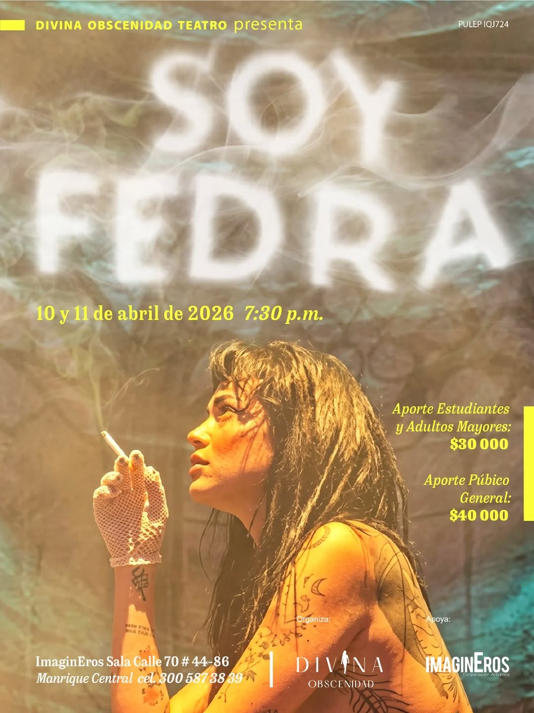Soy Fedra es una obra de teatro contemporáneo en ImaginEros Sala, Medellín, que reinterpreta la tragedia clásica de Fedra desde una mirada política, íntima y sensible. La propuesta de Divina Obscenidad Teatro explora el deseo, la culpa, el poder y el silencio a través del cuerpo, la palabra y una puesta en escena fragmentada que invita al público a una reflexión profunda sobre los vínculos humanos y las tensiones morales de hoy.