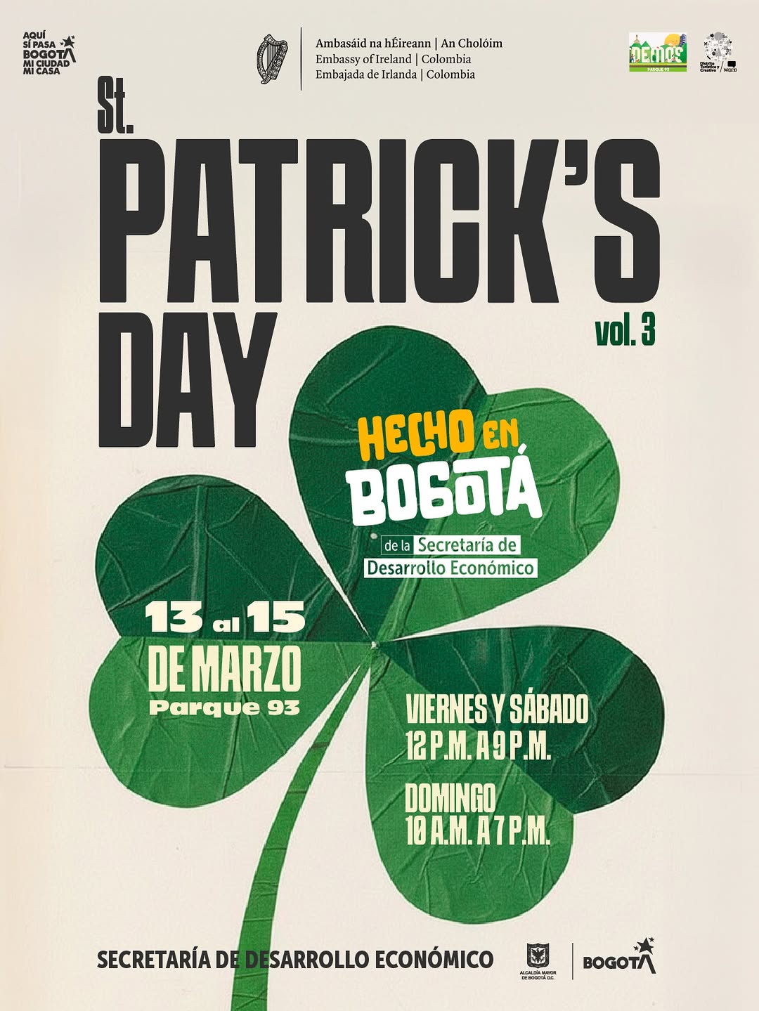 ST. PATRICK’S DAY vol. 3 es una celebración al estilo Hecho en Bogotá que llega al Parque 93 en Bogotá con toda la onda irlandesa. Durante tres días se reúnen emprendimientos locales, cervezas artesanales, gastronomía, accesorios y experiencias para disfrutar una actividad tipo feria y mercado, con ambiente festivo, música y sello bogotano. Un plan ideal para apoyar el talento local y vivir el espíritu de San Patricio en la ciudad.