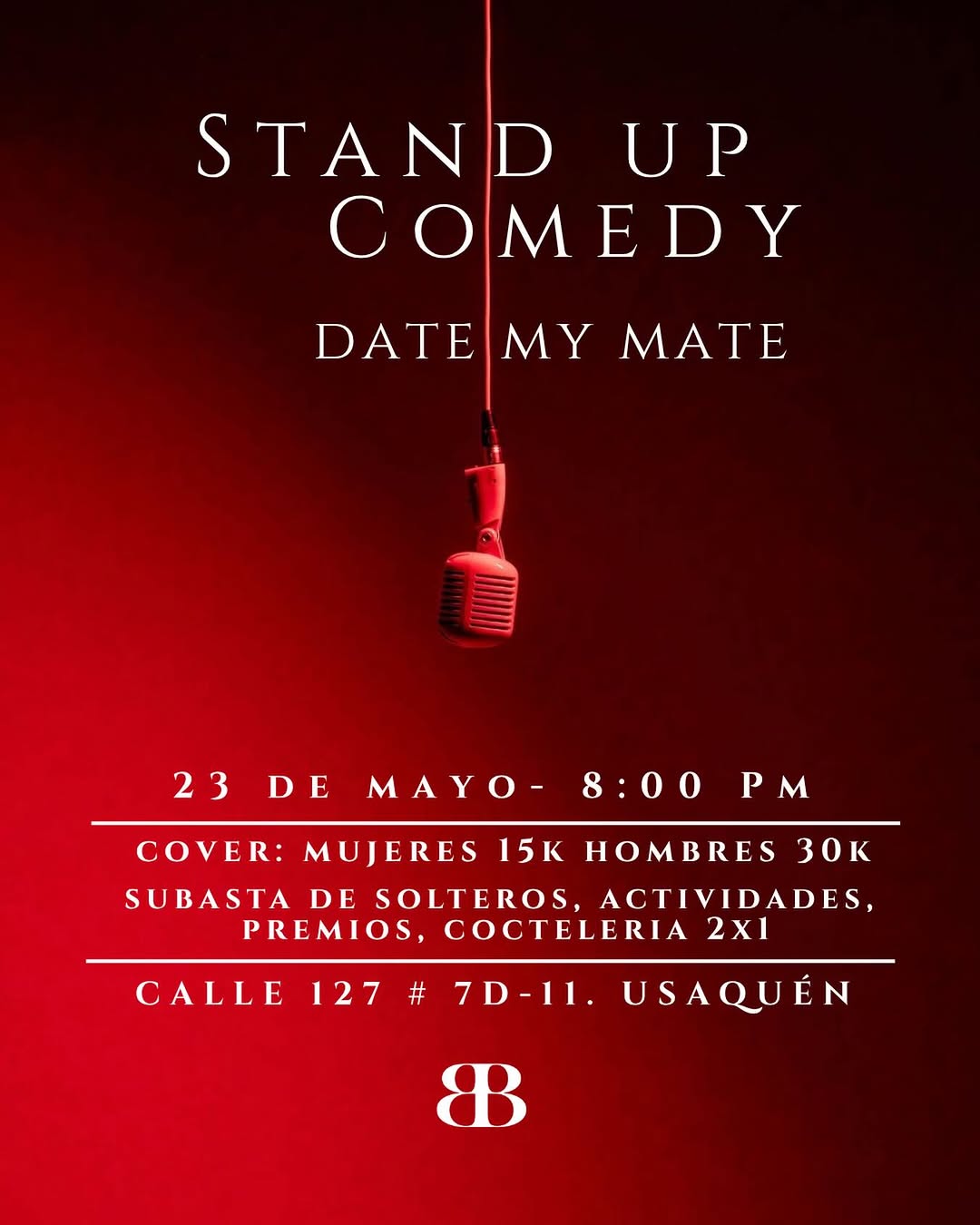 STAND UP COMEDY DATE MY MATE es una noche de comedia en Bogotá pensada para solteros que quieren reírse de sus historias amorosas. En este stand up comedy en BB se hará una divertida subasta de solteros, dinámicas donde tus amigos juegan a ser cupido y premios a las mejores anécdotas de ex. Habrá coctelería 2×1 y un ambiente relajado ideal para conocer gente nueva y pasarla bien.