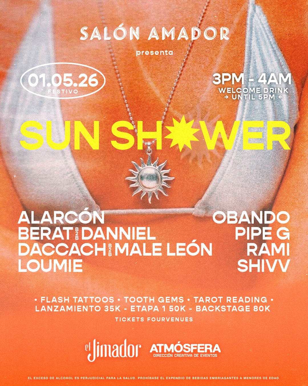 SUN SHOWER es una fiesta de DJ set y clubbing en Salón Amador, Medellín, que reúne a Rami, Obando, Loumie, Pipe G, Shivv y otros talentos de la escena electrónica local. Habrá experiencias como flash tattoos, lectura de tarot y tooth gems, además de margaritas de cortesía en la tarde. Un plan ideal para quienes buscan una noche larga de música electrónica, arte y amigos en la ciudad.
