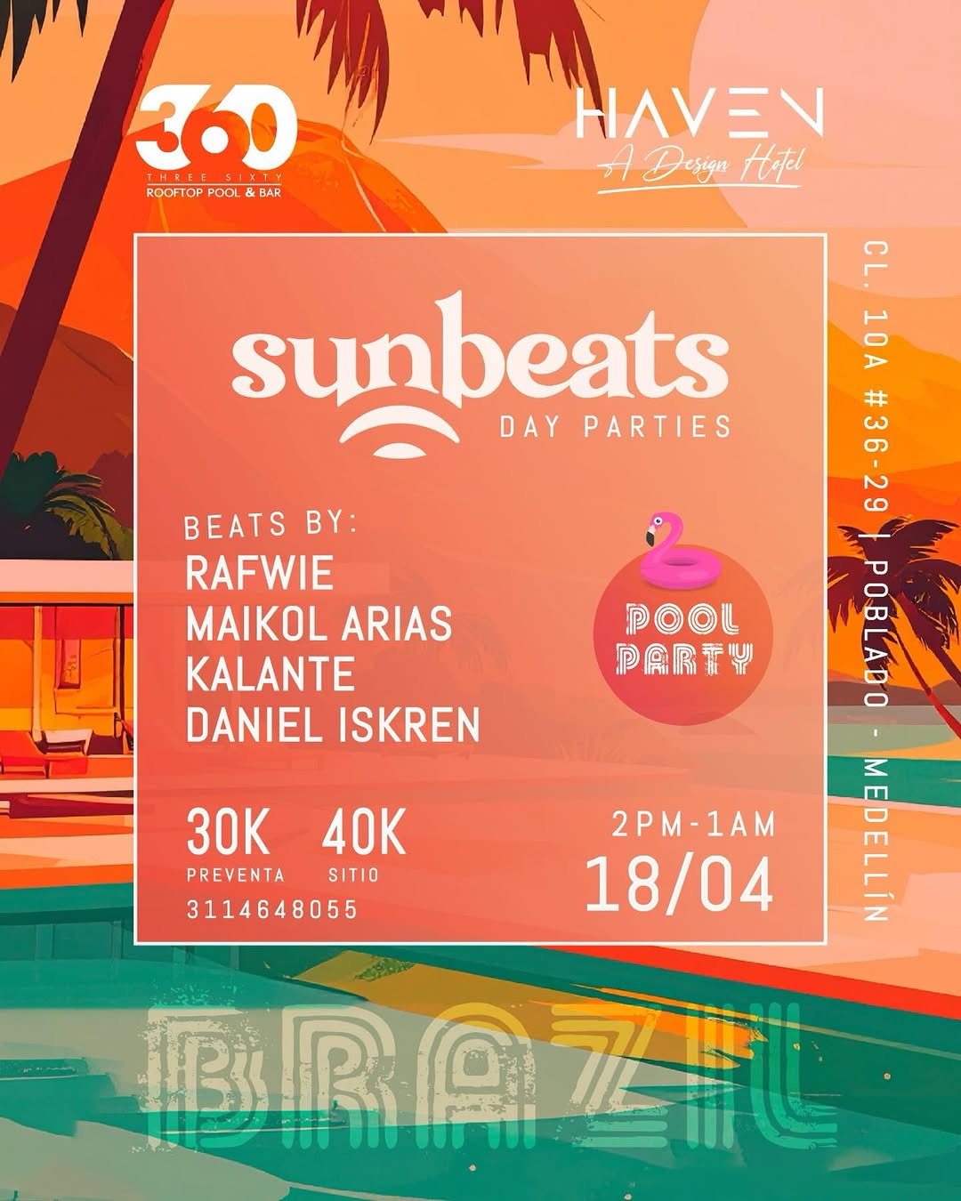 sunbeats DAY PARTIES llega a Medellín con una pool party de electrónica en 360 Rooftop Bar, ideal para disfrutar el atardecer en El Poblado. Con beats de RAFWIE, Maikol Arias, Kalante y Daniel Iskren, este evento promete una experiencia vibrante al aire libre, con ambiente brasileño y enfoque en la fiesta de día. Una opción perfecta para quienes buscan música electrónica, piscina y buena energía en la ciudad.