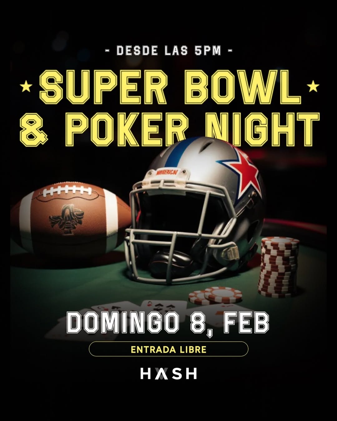 Super Bowl & Poker Night es una noche para disfrutar el partido más importante del fútbol americano mientras compartes mesas de póker en HASH. El evento combina ambiente deportivo, juego y buena energía, ideal para ir con amigos, vivir cada jugada y participar en partidas casuales de cartas. Una opción diferente para ver el Super Bowl en un plan social y relajado en la ciudad.