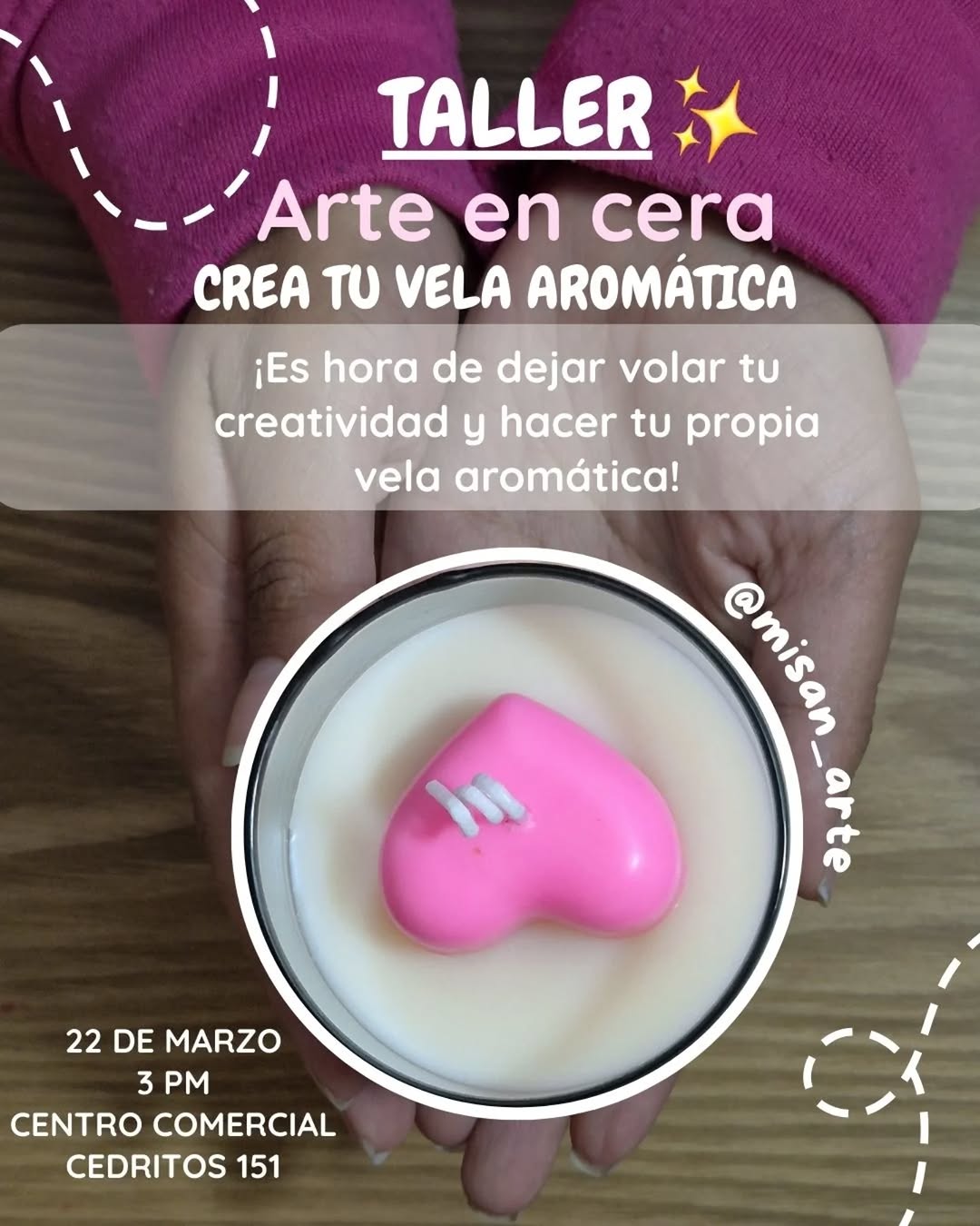 TALLER Arte en cera – CREA TU VELA AROMÁTICA es una experiencia creativa donde aprenderás a elaborar tu propia vela aromática en cera, guiada por misan_arte en el Centro Comercial Cedritos 151, en Bogotá. Es un espacio íntimo y práctico para explorar aromas, colores y técnicas básicas de velas artesanales, ideal para quienes disfrutan del arte hecho a mano y buscan un plan diferente y relajante en la ciudad.