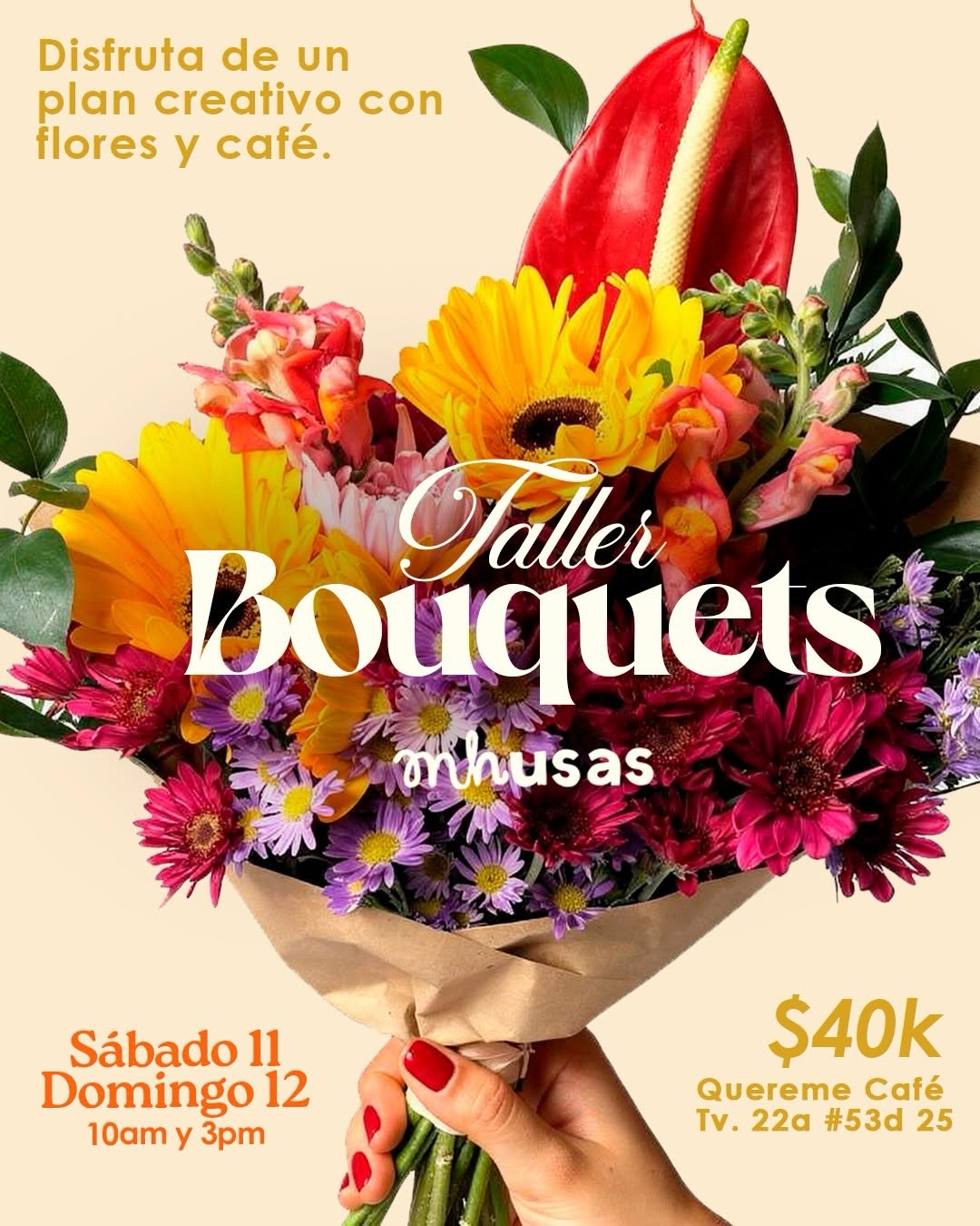 Taller Bouquets es un plan creativo en Bogotá para quienes aman las flores y quieren aprender a armar arreglos tipo bouquet en un ambiente relajado. En este taller práctico en Quereme Café podrás experimentar con diferentes combinaciones florales mientras compartes con otras personas aficionadas al diseño floral. Es una actividad ideal para disfrutar el fin de semana, desconectarte de la rutina y explorar tu lado artístico en un espacio acogedor de la ciudad.