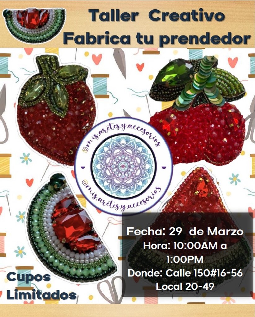 El Taller Creativo Fabrica tu prendedor es una experiencia práctica para aprender el arte del recamado en Bogotá, guiada por mis.aretes.y.accesorios con el apoyo de mentessinespacio y Tienda Creativa MSE. Durante la sesión crearás tu propio prendedor bordado con todos los materiales incluidos, además de un pequeño obsequio y refrigerio. Es un espacio íntimo, con cupos limitados, ideal para amantes de los accesorios hechos a mano y del diseño artesanal que quieran explorar nuevas técnicas creativas.