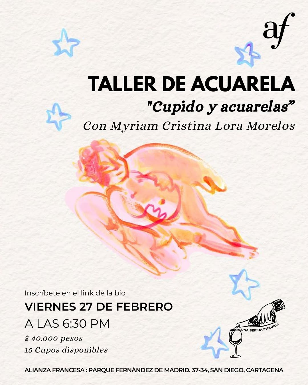 Cupido y Acuarelas es un taller de acuarela en la Alianza Francesa de Cartagena, guiado por la artista Myriam Cristina Lora Morelos. En este espacio creativo podrás experimentar con el color, explorar símbolos del amor y desarrollar una pieza artística propia, sin necesidad de experiencia previa. Es una actividad ideal para quienes buscan un plan cultural diferente en Cartagena, combinando arte, aprendizaje y un ambiente íntimo con cupos limitados.