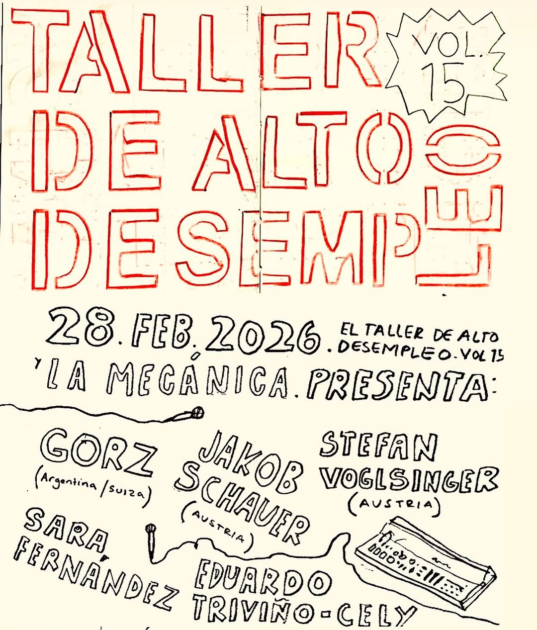 Taller de Alto Desempleo Vol.15 llega a La Mecanica en Bogota como un laboratorio de ruido, artes vivas radicales y poesia expandida. Esta actividad experimental reune a GORZ, Jakob Schauer, Stefan Voglsinger, Eduardo Trivino-Cely y Sara Fernandez en una noche de exploracion sonora extrema y performance. Un encuentro para quienes buscan propuestas divergentes, disonantes y subterráneas dentro de la escena musical y artistica contemporanea de la ciudad.