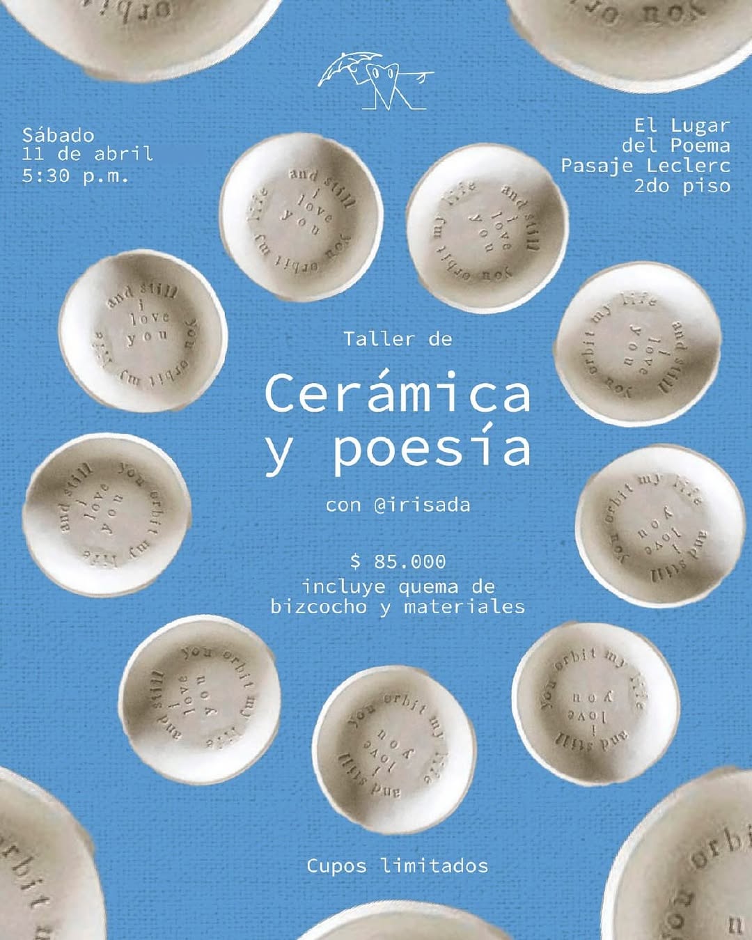 El Taller de cerámica y poesía es una experiencia creativa donde podrás llevar tu poema favorito y transformarlo en una pieza en barro, guiado por la artista @_irisada en El Lugar del Poema. En este taller en Colombia explorarás la relación entre palabra y objeto, trabajando el modelado y la expresión personal. Es una actividad íntima, con cupos limitados, ideal para quienes disfrutan la poesía, el arte y las manualidades en un ambiente tranquilo y cuidado.