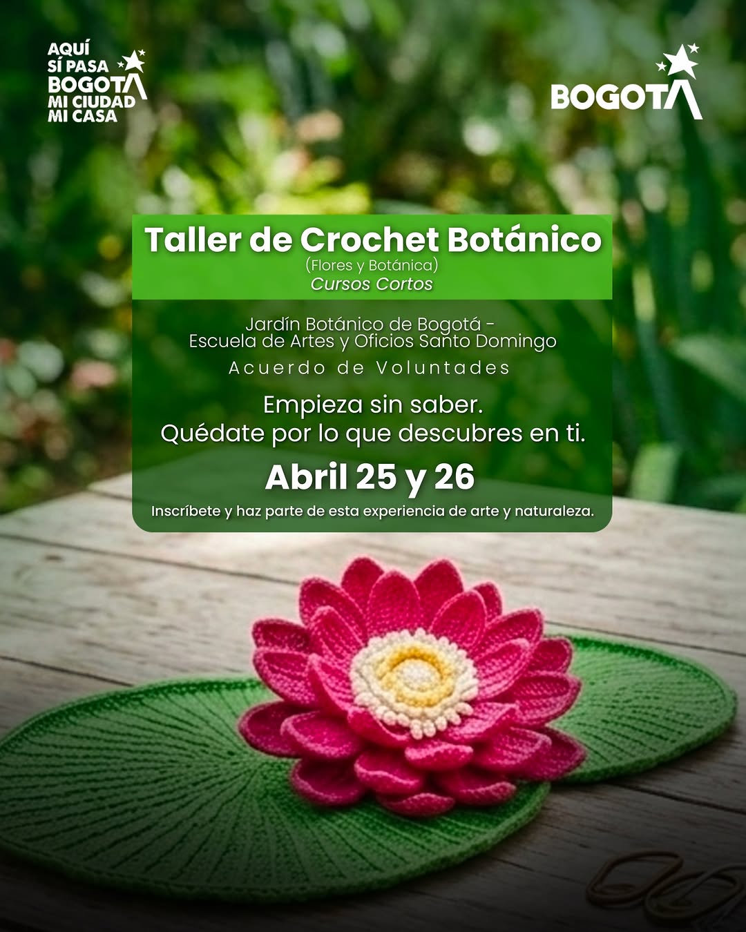 Taller de Crochet Botánico es un curso corto donde el Jardín Botánico de Bogotá y la Escuela de Artes y Oficios Santo Domingo se unen para explorar la relación entre arte y naturaleza en Bogotá. En este taller aprenderás crochet inspirado en flores y botánica, sin necesidad de experiencia previa, mientras creas una pieza textil propia. Es una actividad creativa y formativa ideal para quienes buscan conectar con la naturaleza a través de una experiencia manual y artística.