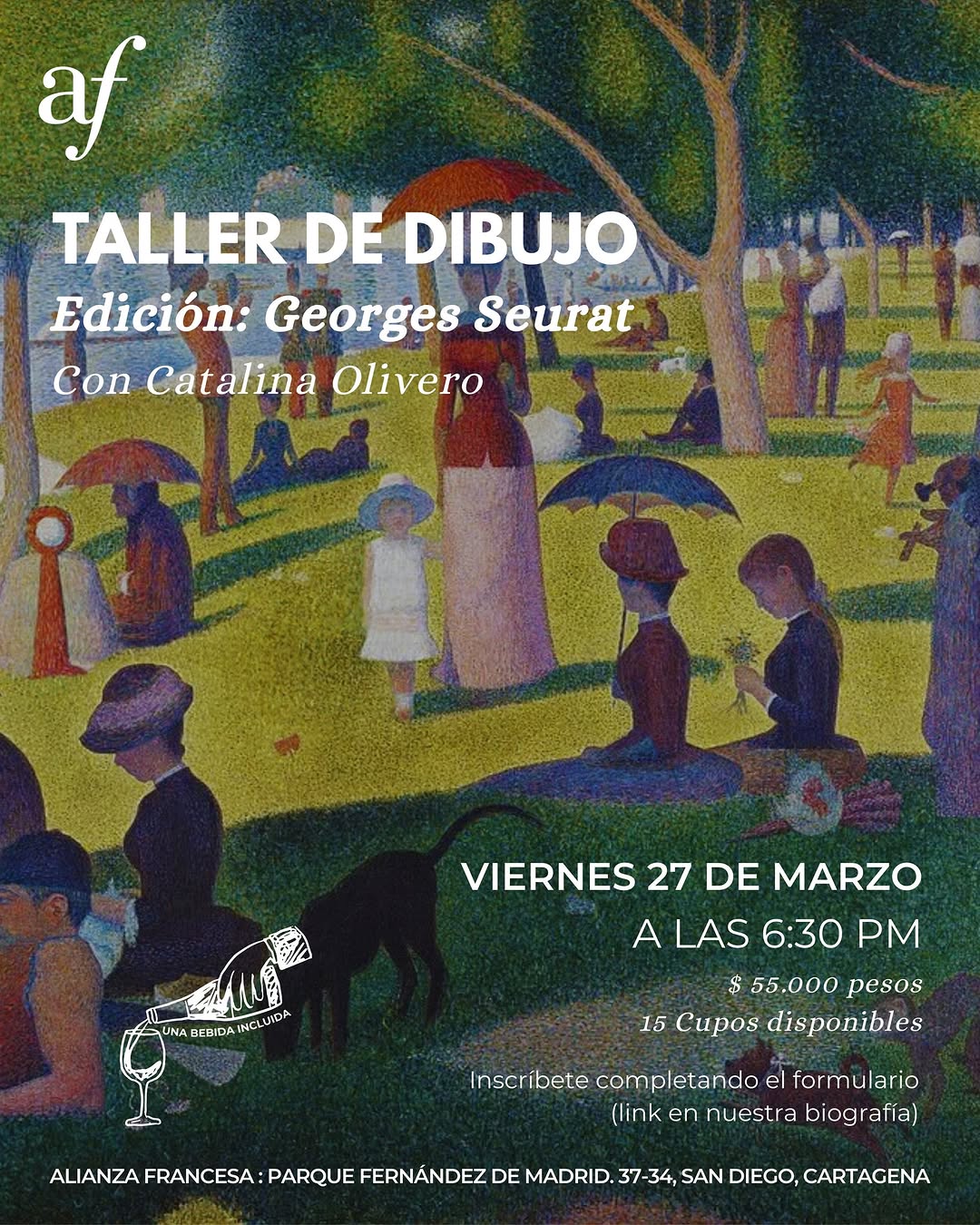 El Taller de Dibujo Edición Georges Seurat con Catalina Olivero en la Alianza Francesa de Cartagena propone una experiencia creativa para explorar la obra y la técnica de este artista. A través de ejercicios guiados, las personas participantes experimentarán con el dibujo y crearán sus propias composiciones en un ambiente relajado, acompañado de una bebida incluida. Es una oportunidad ideal para acercarse al arte, aprender recursos plásticos y compartir con otros amantes del dibujo en Cartagena.