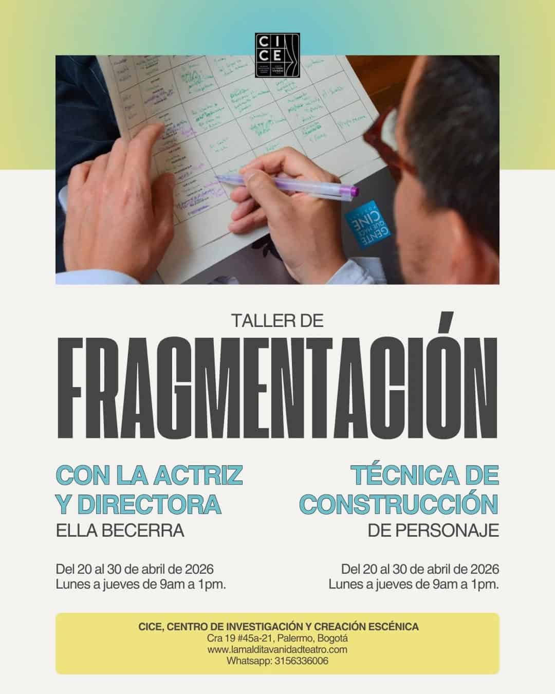 Descubre el arte de la construcción de personajes en el Taller de Fragmentación, dirigido por la reconocida actriz y directora Ella Becerra. Este taller, organizado por CICE – La Maldita Vanidad Teatro, se llevará a cabo en el Centro de Investigación y Creación Escénica en Bogotá. Una oportunidad única para sumergirse en el mundo del teatro y aprender de los mejores en la industria.