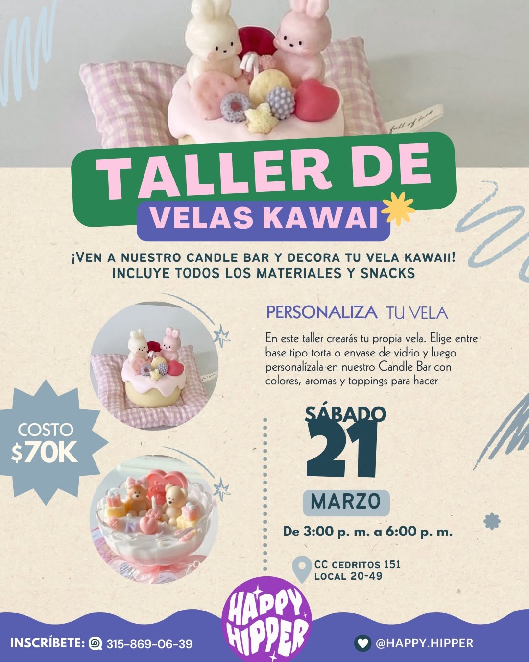 TALLER DE VELAS KAWAII es un taller creativo en el candle bar de HAPPY HIPPER en Bogotá, ideal para quienes aman la decoración y el estilo kawaii. Podrás diseñar tu propia vela eligiendo entre base tipo torta o envase de vidrio y luego personalizarla con colores, aromas, frosting y divertidos toppings. La experiencia incluye todos los materiales, un ambiente relajado y un mini brunch perfecto para compartir una tarde diferente en la ciudad.