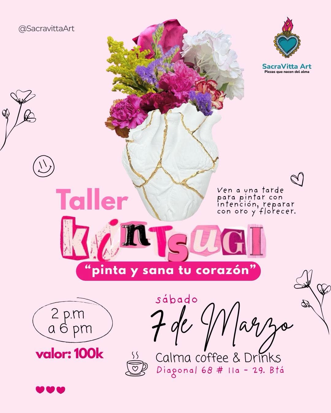 El Taller kintsugi pinta y sana tu corazón es una experiencia creativa y terapéutica en Bogotá, guiada por SacraVitta Art. A través de la técnica japonesa del kintsugi, las personas pintan un corazón de cerámica y lo reparan con detalles dorados, honrando sus cicatrices emocionales. Es una actividad íntima y artística ideal para compartir con amigos o pareja, o para vivir en solitario como un espacio de introspección y conexión personal.