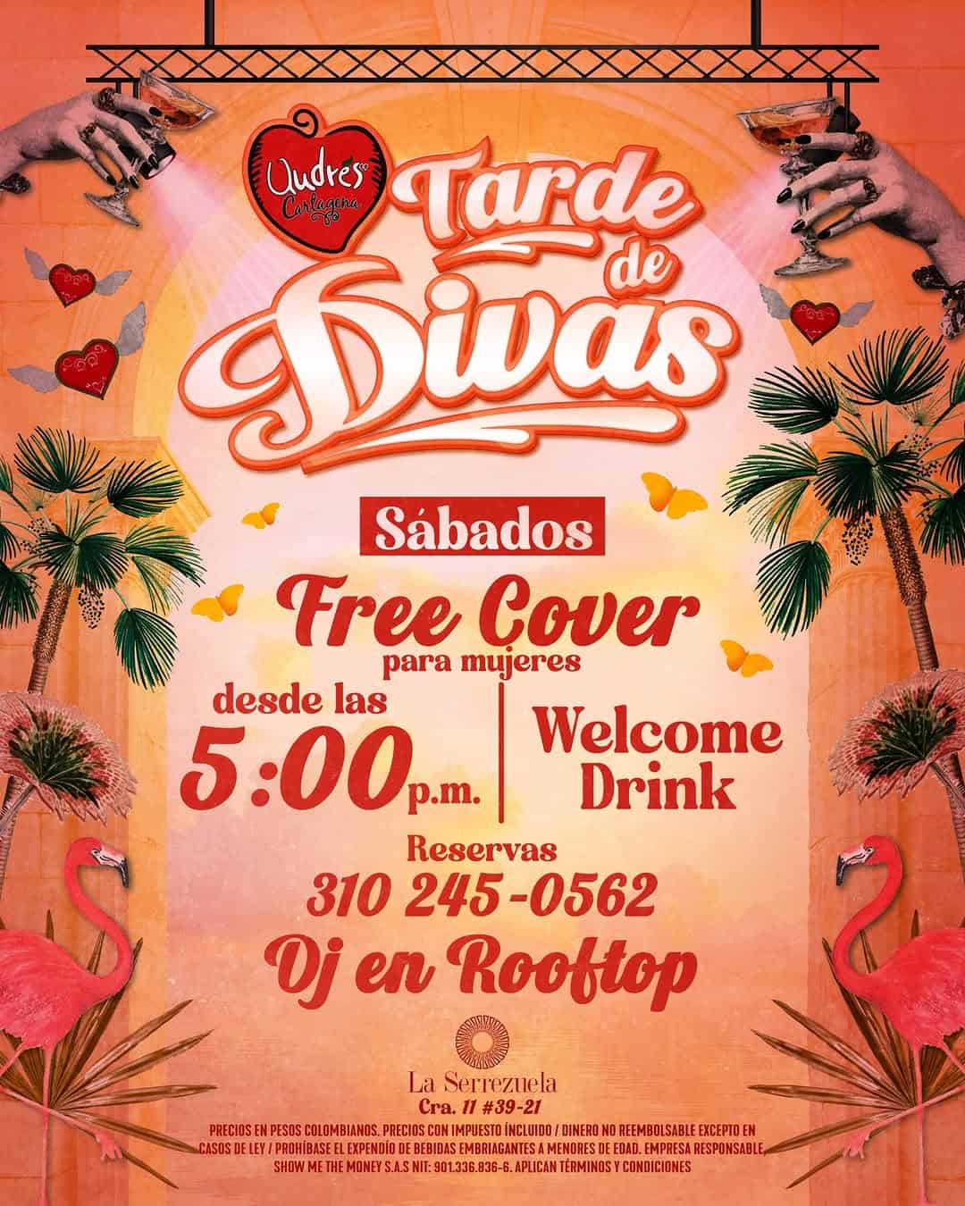 Tarde de Divas es una experiencia pensada para mujeres en Oudres Cartagena, en la ciudad de Cartagena. Es una tarde de fiesta y socialización con ambiente de rooftop, música en vivo a cargo de DJ y detalles especiales como bienvenida y atenciones para ellas. Un plan ideal para iniciar la noche con buena energía, compartir entre amigas y disfrutar de una rumba diferente en un espacio exclusivo.