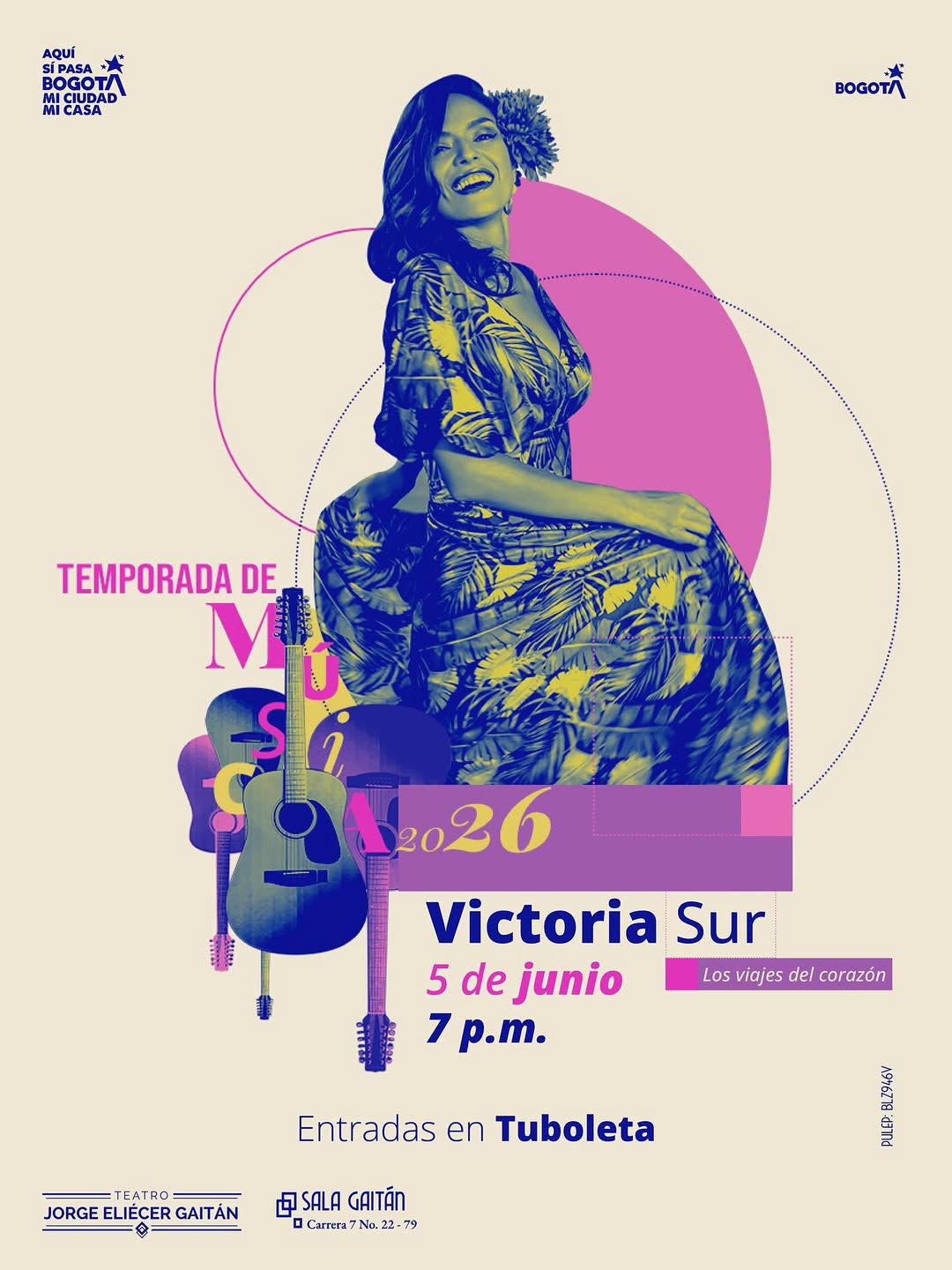 “TEMPORADA DE MÚSICA 2026 – Los viajes del corazón” es un concierto íntimo en la Sala Gaitán del Teatro Jorge Eliécer Gaitán en Bogotá, protagonizado por la cantautora Victoria Sur en formato acústico. A través de voz y guitarra, acompañada por la guitarra de Carlos Mario Muñoz, el público recorrerá distintas emociones ligadas al amor y la memoria musical latinoamericana, en una experiencia cercana, sensible y profundamente emotiva.