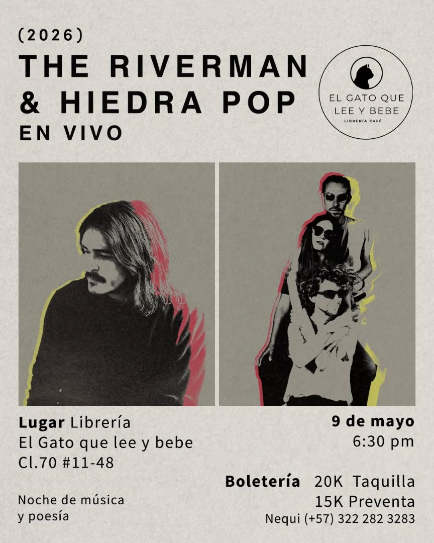 THE RIVERMAN & HIEDRA POP EN VIVO será una noche íntima de música y poesía en Bogotá, donde The Riverman presentará canciones de su nuevo material previo al lanzamiento de su tercer álbum de estudio, acompañado del proyecto Hiedra Pop, que fusiona pop y poesía declamada. En este concierto los asistentes podrán disfrutar de un formato cercano y sensible, ideal para quienes buscan una experiencia artística diferente en la ciudad.