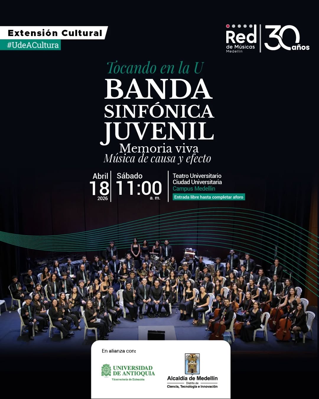 “Tocando en la U” regresa al Teatro Universitario con el concierto Memoria viva, Música de causa y efecto, a cargo de la Banda Sinfónica Juvenil en Medellín. Este evento celebra los 30 años de la Red de Músicas de Medellín con un formato sinfónico pensado para disfrutar en familia y con amigos. Será una mañana musical para conectarse con la memoria, las emociones y el talento juvenil de la ciudad en un ambiente cercano y festivo.