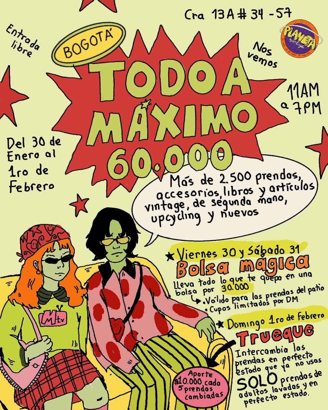 ¡No te pierdas la oportunidad de asistir a ‘TODO A MÁXIMO 60.000’ en Bogotá! Este evento de venta de garaje y mercado vintage te ofrece más de 2.500 prendas y artículos vintage y de segunda mano a no más de 60k. Además, podrás participar en la ‘Bolsa mágica’, donde todo lo que te quepa te costará solo 30k. También podrás intercambiar lo que ya no usas en nuestro ‘Trueque’. ¡Te esperamos en Planeta Vintage Bogotá!