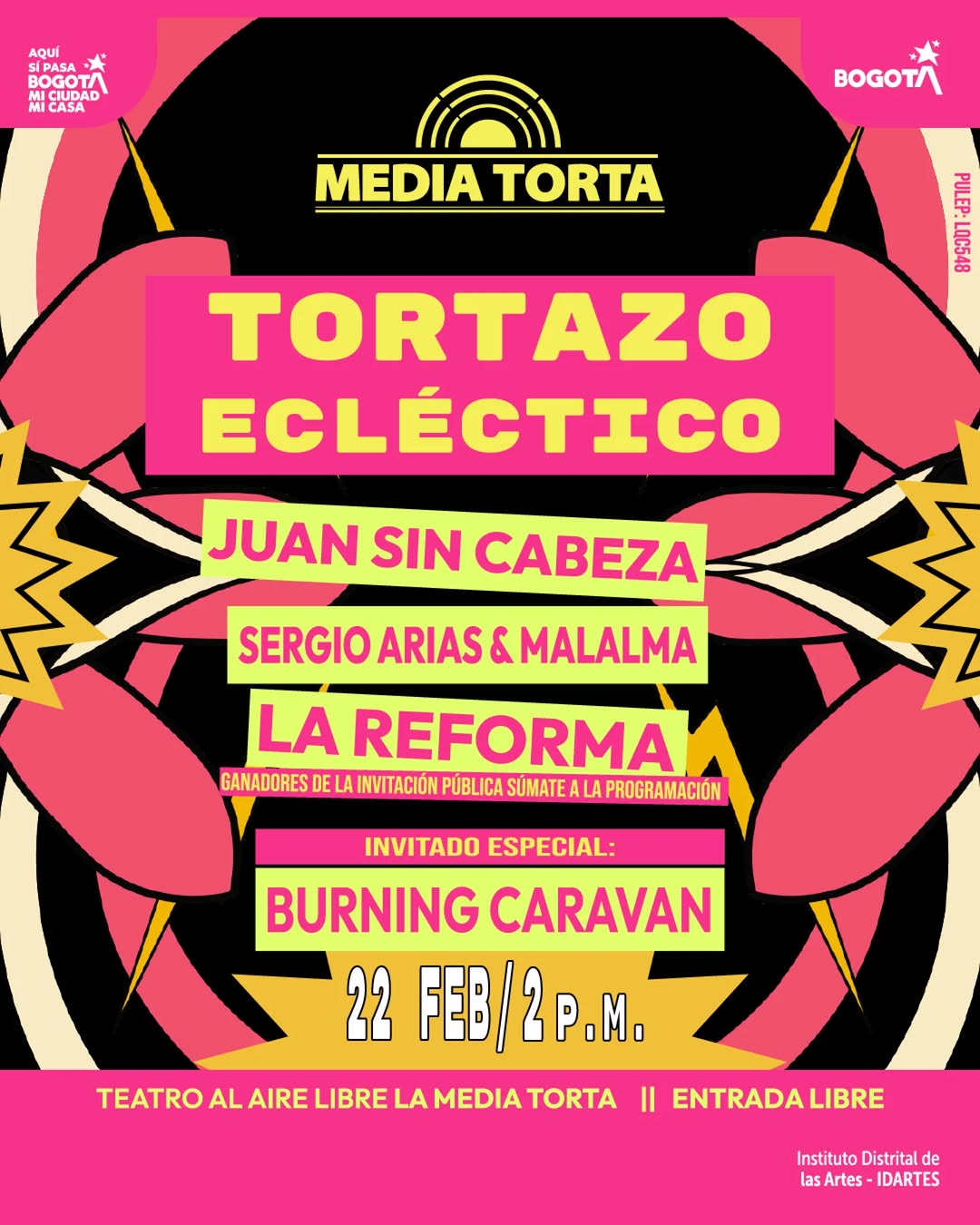 Tortazo Ecléctico es un concierto en Bogotá que reúne propuestas sonoras diversas en el Teatro al Aire Libre La Media Torta. En esta edición se presentan Juan Sin Cabeza, Sergio Arias y Malalma, La Reforma y como invitado especial Burning Caravan, agrupaciones seleccionadas en la invitación pública Súmate a la Programación de Idartes. Un encuentro para disfrutar fusiones, estéticas variadas y un ambiente musical vibrante en la ciudad.