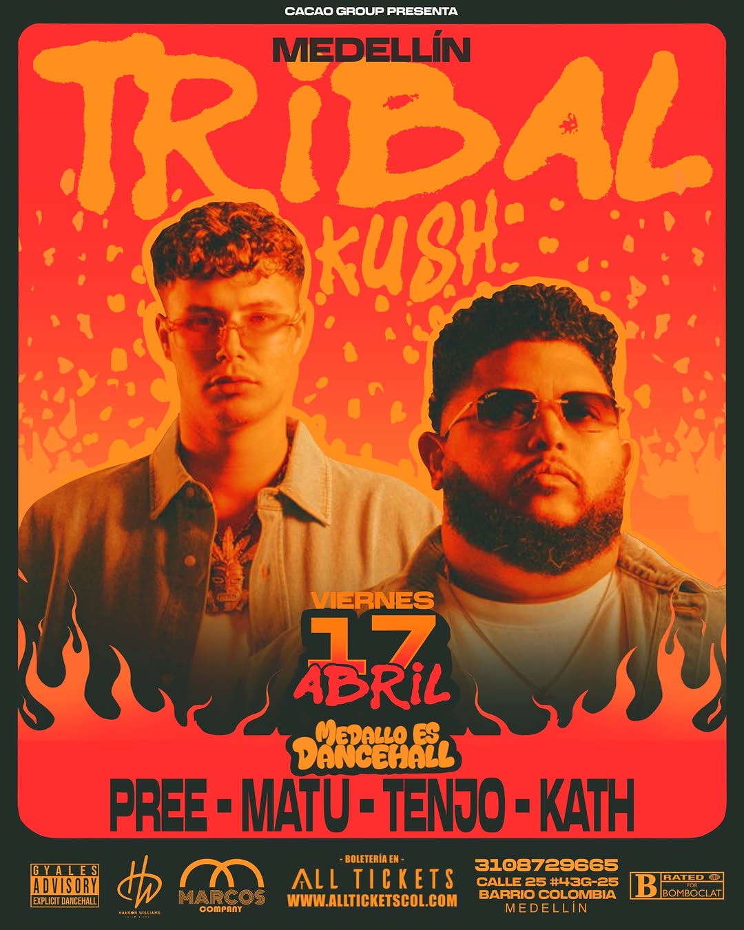 TRIBAL KUSH llega a Medellín como parte de Cacao Fest con un poderoso DJ set de dancehall. Este evento de DJ Set / Clubbing reúne a uno de los dúos de productores más importantes del género a nivel mundial, directamente desde Europa, junto a talentos locales como Pree, Matu, Tenjo y Kath. Una noche para vivir el dancehall, el sabor y la energía de la fiesta urbana en Medellín.