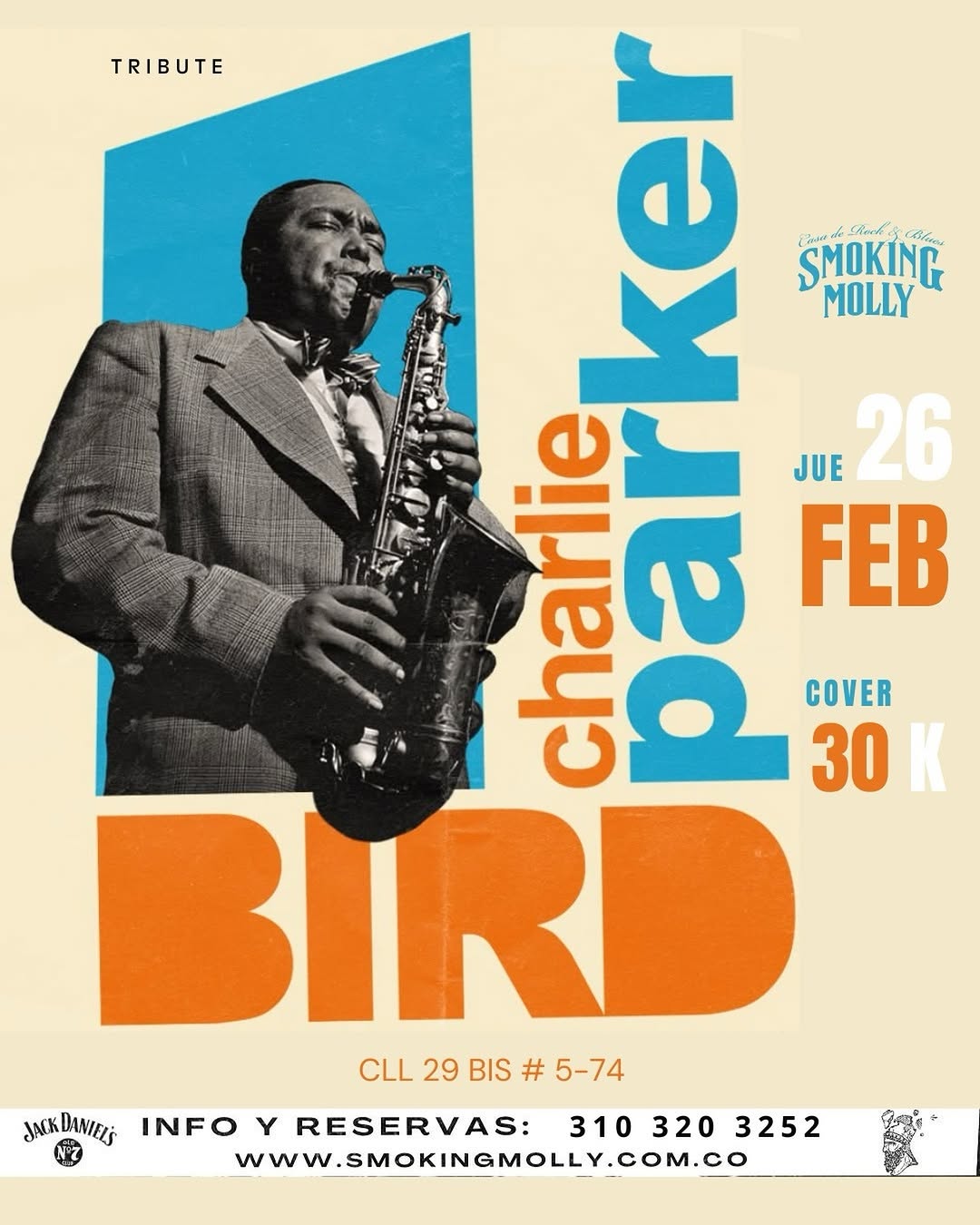 Charlie Parker Tribute – The Bird Lives es un concierto de jazz en vivo dedicado al legado del mítico saxofonista en Smoking Molly, en Bogotá. Una noche de bebop intenso, improvisación y virtuosismo para músicos, melómanos y amantes del jazz real. Este tributo celebra la influencia de Charlie Parker en la historia del jazz y reúne a quienes disfrutan de jam sessions llenas de energía y alma.