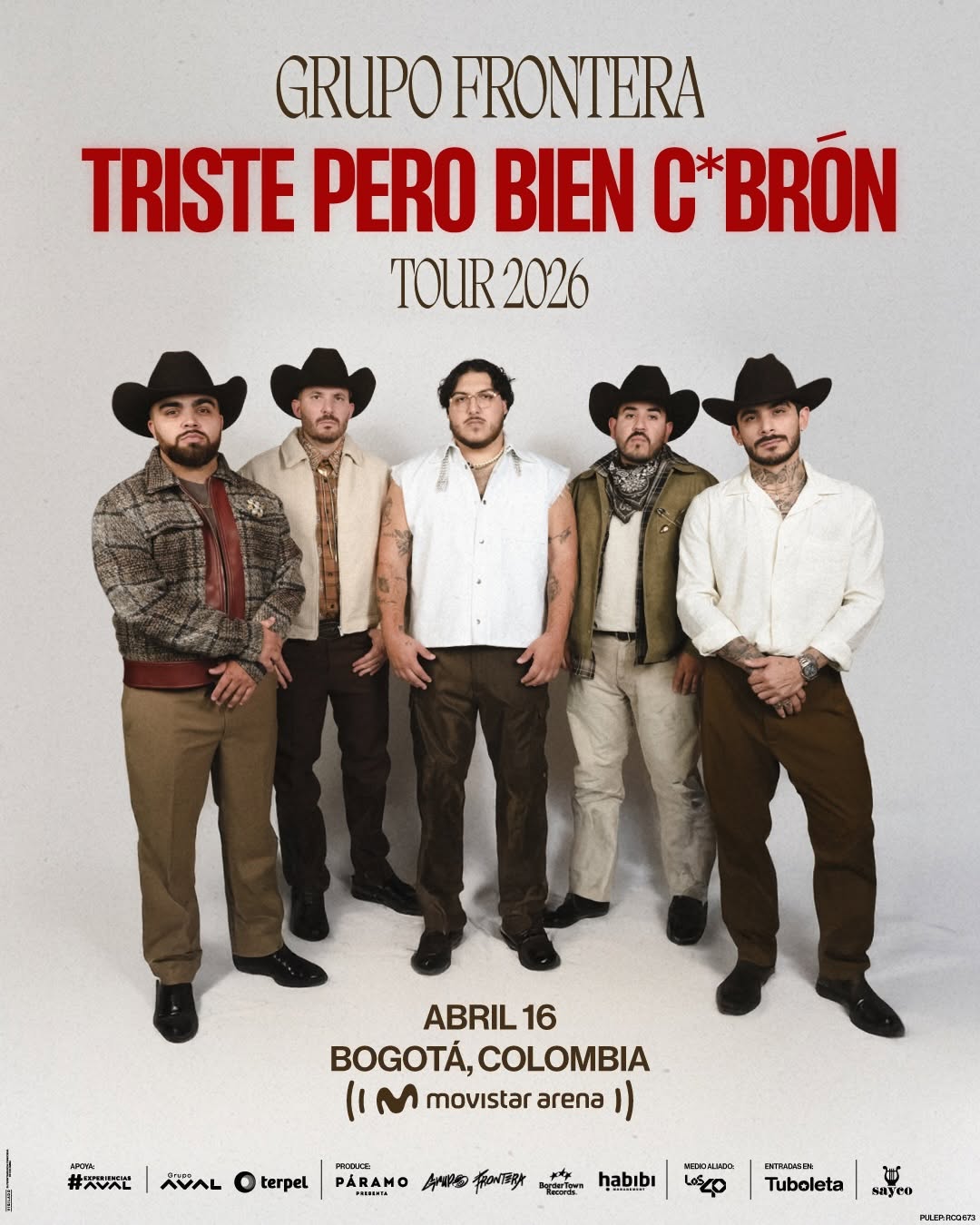 TRISTE PERO BIEN C*BRÓN TOUR 2026 llega a Bogotá con Grupo Frontera en concierto en el Movistar Arena. El grupo de regional mexicano presentará en vivo sus grandes éxitos y nuevas canciones en un show cargado de energía, romanticismo y despecho. Será una noche para cantar a todo pulmón, vivir una experiencia masiva con sonido potente y puesta en escena de gran formato, ideal para los fans del género en Colombia.