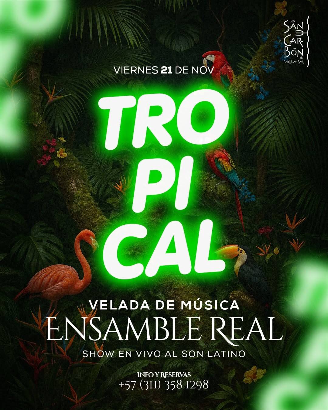 Este 21 de noviembre, vive la auténtica experiencia de la salsa, el son y el fuego en San Carbón Parrilla-Bar. La agrupación internacional Ensamble Real protagoniza una velada llena de ritmos tropicales que encenderán la pista de baile. Disfruta de cocteles vibrantes y cortes premium mientras te sumerges en una noche de pura energía latina. Prepárate para una fiesta tropical donde la música en vivo será el alma de la noche, ¡no te lo puedes perder!