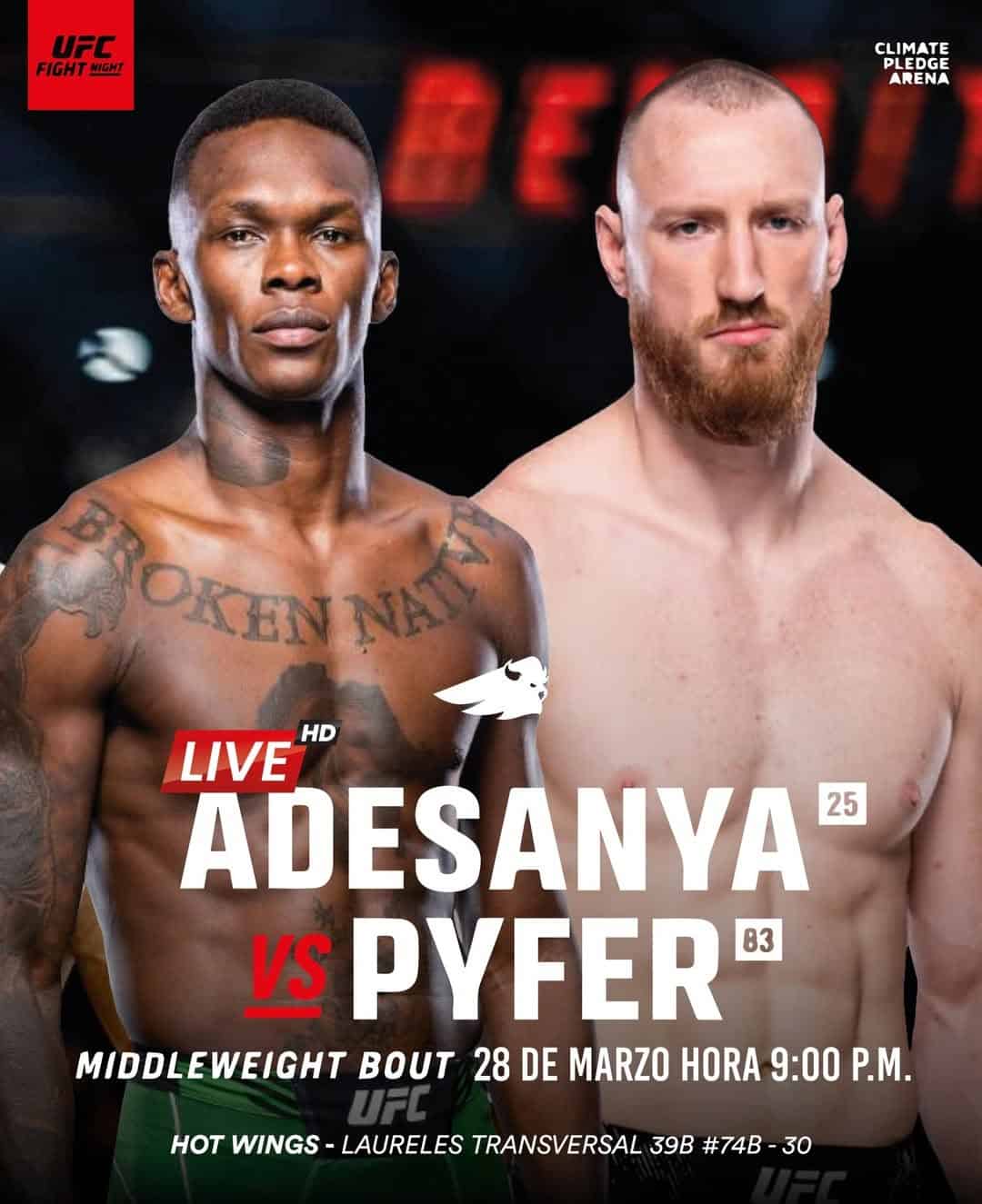UFC Fight Night llega a Hot Wings con la transmisión en vivo de la pelea Adesanya vs Pyfer, un combate de peso medio ideal para los verdaderos hinchas de la UFC en Medellín. Será una noche para disfrutar en grupo, con combos de comida, cerveza fría y ambiente de bar deportivo, perfecta para vivir cada round con emoción y pantalla en alta definición.