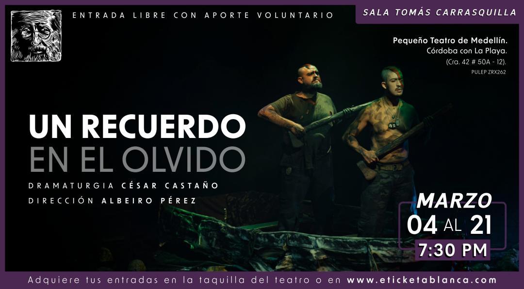 En una noche interminable, dos figuras emblemáticas, un sargento y un soldado, navegan por un río incierto, donde cada remada es un eco del pasado. Entre risas, confesiones y silencios profundos, se enfrentan al peso de la memoria y a la delgada línea que separa el recuerdo del olvido. La obra, escrita por César Castaño y dirigida por Albeiro Pérez, invita a una profunda reflexión sobre las huellas del conflicto en el día a día. Con una atmósfera poética, musicalización original y evocadoras proyecciones, cada instante se convierte en un viaje emocional que desafía al espectador a explorar la historia reciente de nuestro entorno. La experiencia dura 55 minutos y deja una huella imborrable en el corazón.