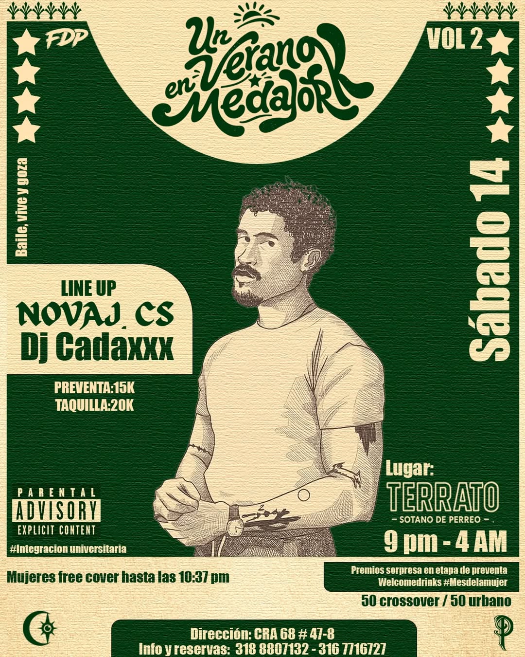 Un Verano en Medaior VOL 2 es una fiesta de baile y rumba latina en Terrato, Medellín, con una mezcla 50% crossover y 50% urbano. La noche estará a cargo de NOVAJ. CS y Dj Cadaxxx, creando un ambiente de combo, perreo y buena vibra. Habrá dinámicas especiales para mujeres, premios sorpresa para quienes compren en preventa y welcomedrinks, ideal para quienes buscan un plan de fiesta latina intensa en la ciudad.
