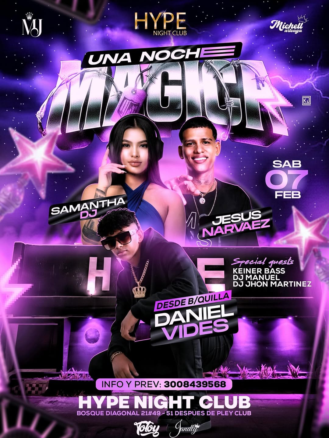Una Noche Magica llega a Hype Night Club en Barranquilla como una fiesta ideal para amantes de la rumba y el perreo. Samantha DJ, Jesus Narvaez, Daniel Vides y los special guests Keiner Bass, DJ Manuel y DJ Jhon Martinez se unen en un DJ set cargado de electrónica y reggaetón. Será una experiencia de clubbing intensa, con energía alta y ambiente fiestero para disfrutar hasta el final de la noche.