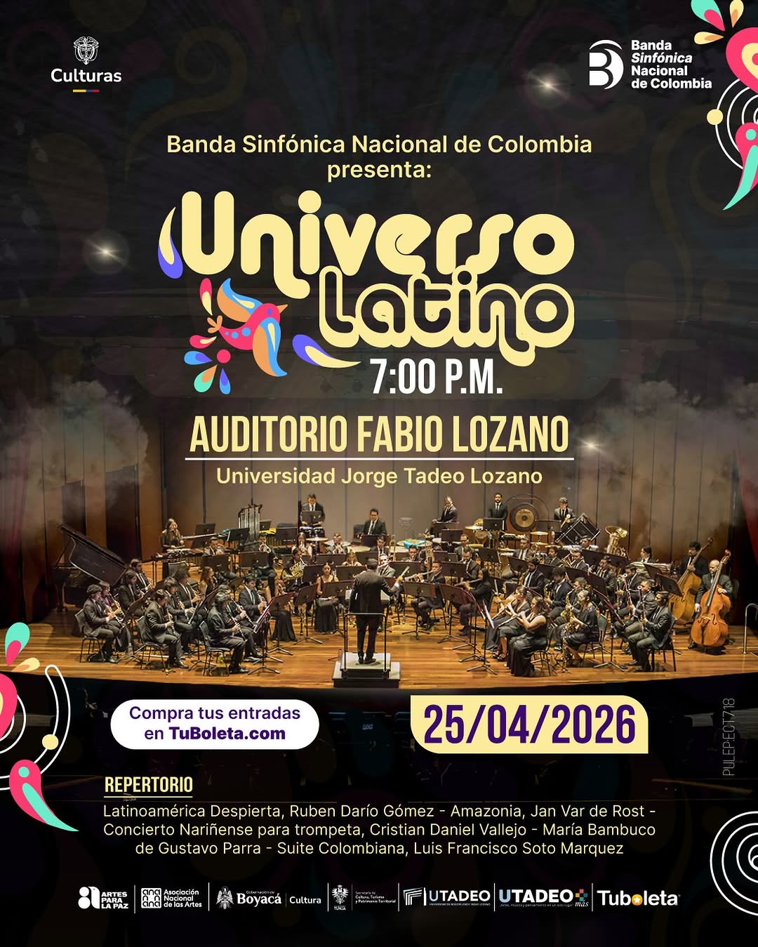 Universo Latino es un concierto de la Banda Sinfónica Nacional de Colombia en el Auditorio Fabio Lozano de Bogotá, donde se exploran los sonidos y paisajes de Latinoamérica. El programa incluye obras inspiradas en la Amazonía, el Bambuco, repertorio colombiano y latinoamericano, creando una experiencia sinfónica que resalta la identidad del continente. Una noche ideal para amantes de la música sinfónica y de la cultura latinoamericana en la capital.