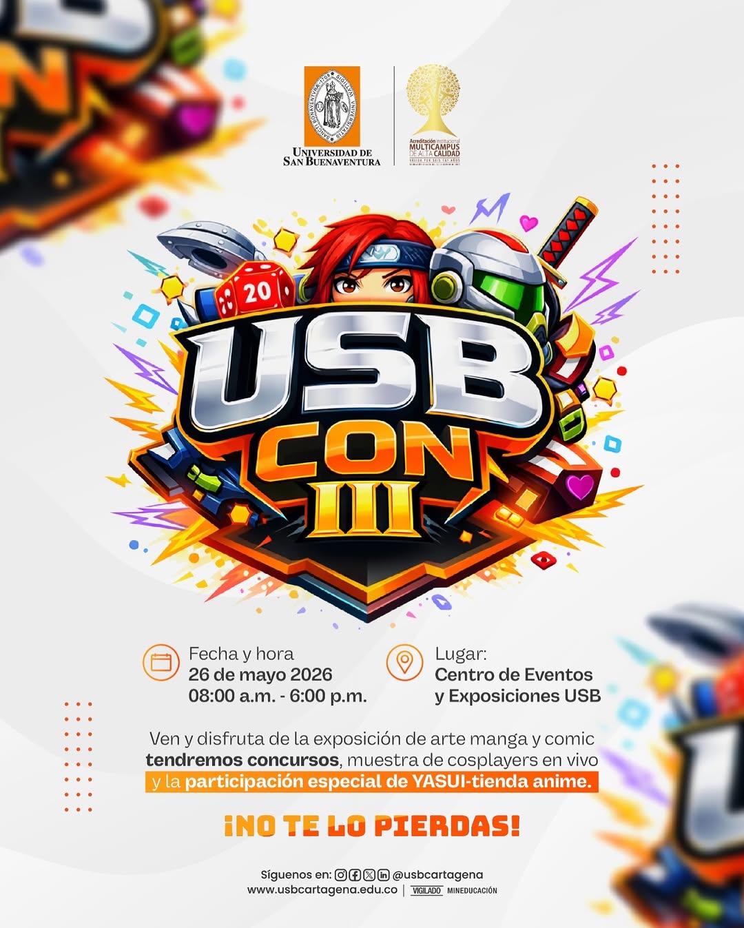 USB CON III es una convención geek organizada por Bienestar Institucional y la clase de Artes Plásticas de la Universidad de San Buenaventura en Cartagena. Será una jornada dedicada al arte manga y el cómic, con concursos, presentaciones de cosplay en vivo y la participación especial de YASUI, tienda anime invitada. Un espacio ideal para la comunidad otaku y geek que quiere compartir, expresarse y disfrutar de la cultura pop japonesa en un ambiente creativo y universitario.