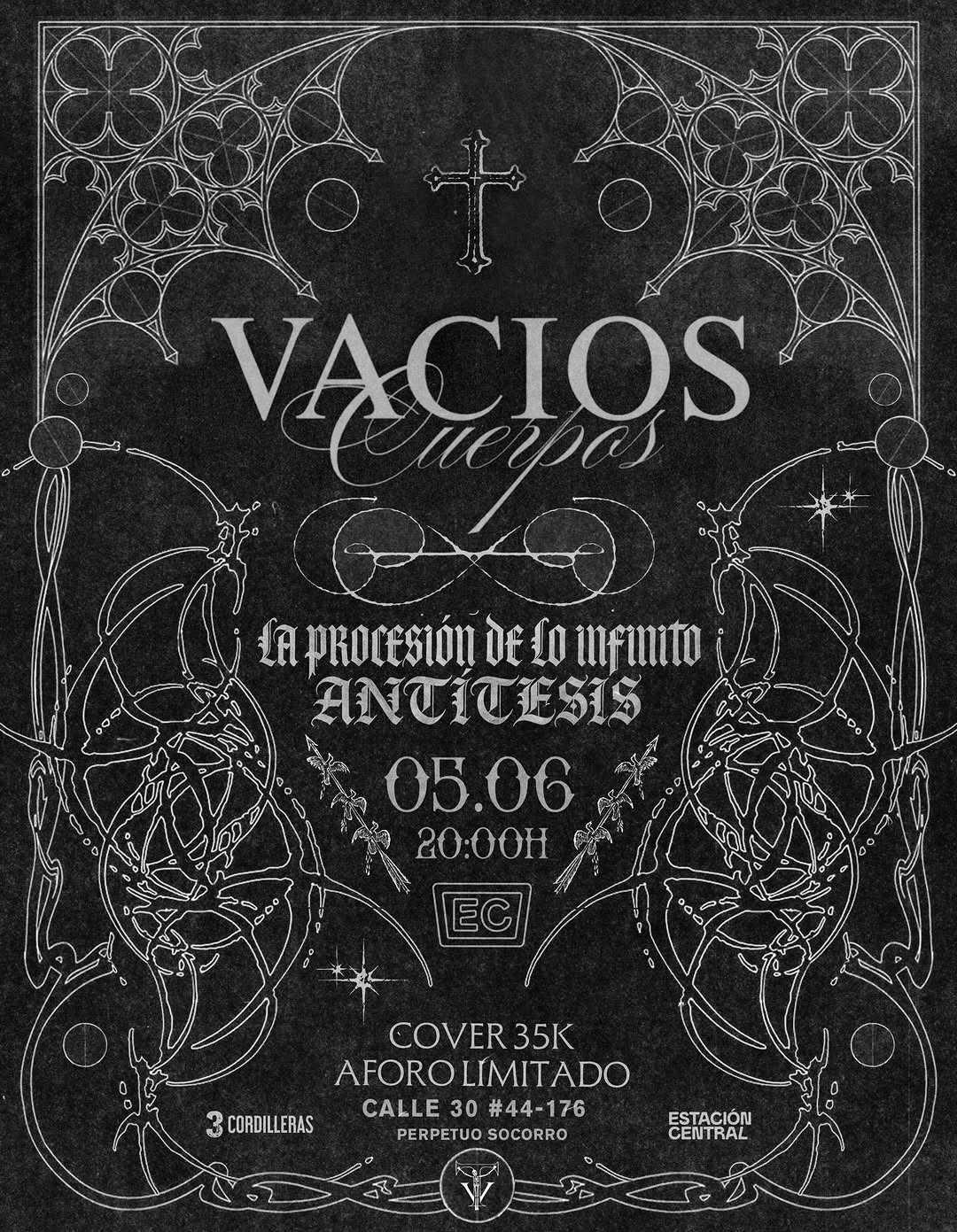 VACIOS Cuerpos es un concierto de post punk que llega desde Oaxaca a Estación Central en Medellín, acompañado por las bandas La Procesión de lo Infinito y Antítesis.33. Será una noche intensa para los amantes del sonido oscuro, alternativo y underground, con aforo limitado para una experiencia cercana con los artistas. Un plan ideal para disfrutar de la escena post punk en vivo y conectar con la movida independiente de la ciudad.