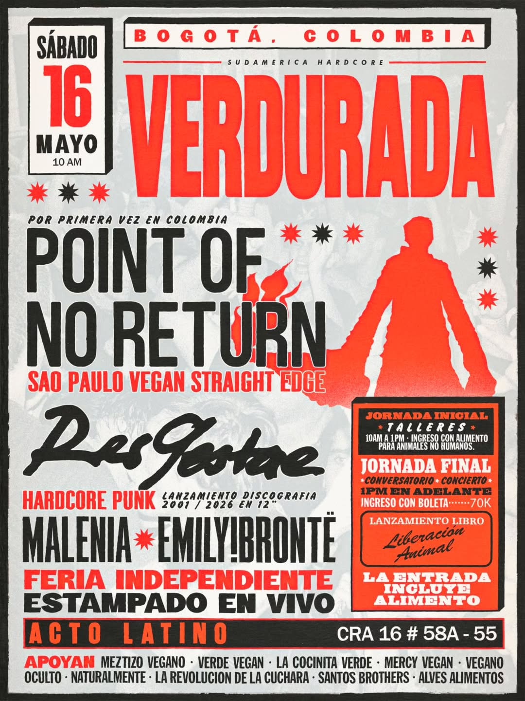 Verdurada es una jornada de hardcore sudamericano y activismo vegan straight edge en Bogotá, con la legendaria banda Point of No Return desde São Paulo y agrupaciones locales como Resgestae, Malenia y Emily Brontë. El evento combina concierto, feria independiente, estampado en vivo y actividades alrededor de la liberación animal, incluyendo el lanzamiento de un libro. Una experiencia intensa de música, comunidad y acción política en Acto Latino.