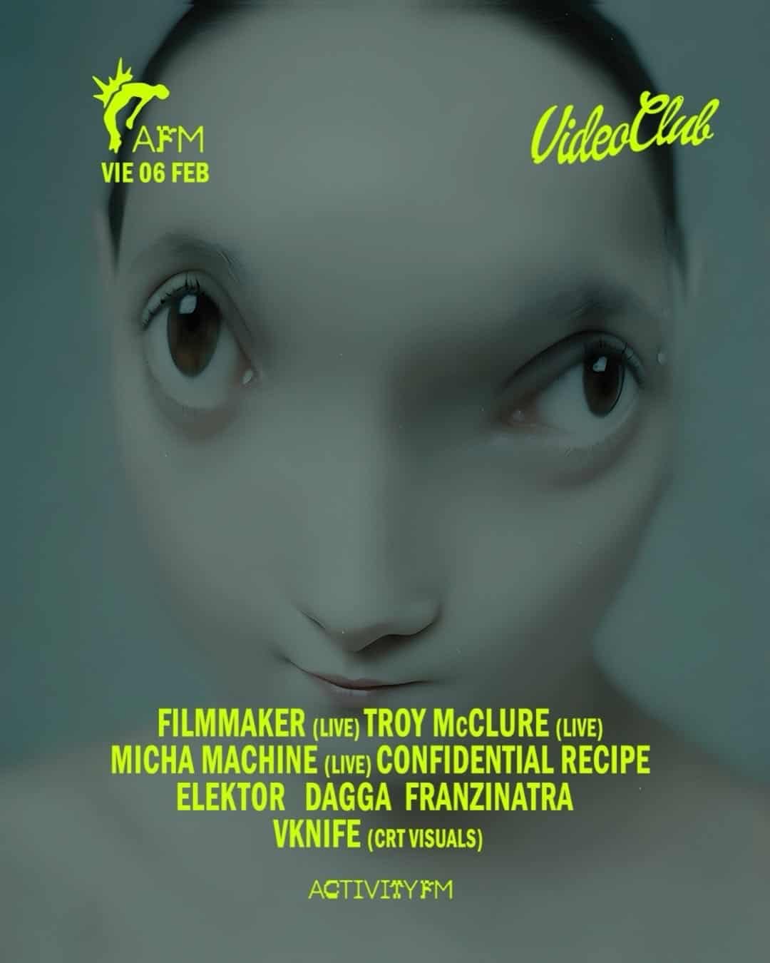 AFM LIVE es una fiesta electrónica organizada por ACTIVITY FM en VIDEOCLUB. Este evento contará con la participación de artistas como FILMMAKER, TROY McCLURE, MICHA MACHINE, CONFIDENTIAL RECIPE, ELEKTOR, DAGGA, FRANZINATRA y VKNIFE. Prepárate para una noche llena de música y diversión.