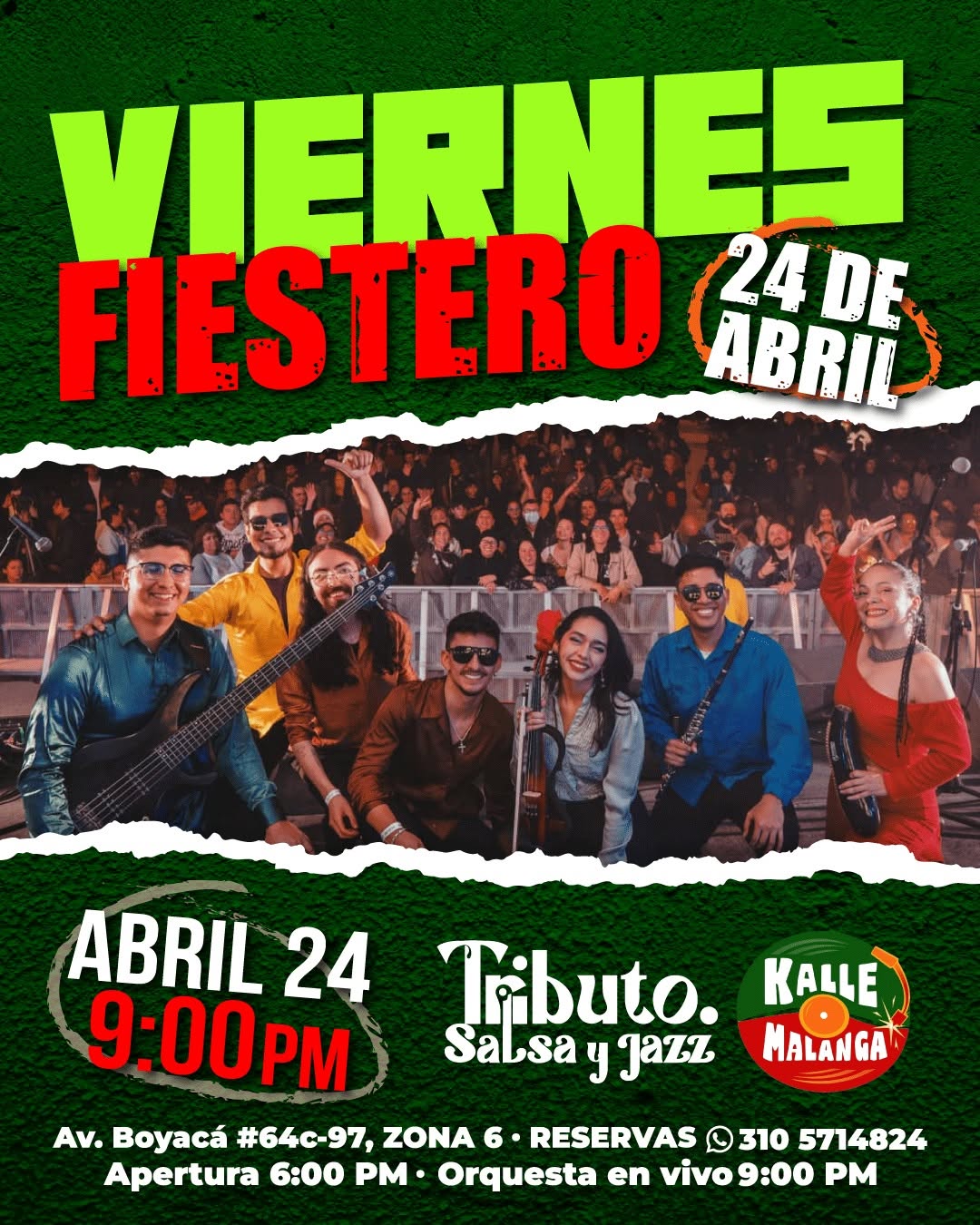 VIERNES FIESTERO es una noche de tributo a la salsa y el jazz con orquesta en vivo en Tributo Salsa Y Jazz, en Bogotá. El plan promete rumba intensa, buena energía y mucho baile, ideal para amantes de la salsa y la música en vivo que buscan un plan nocturno auténtico en la ciudad. Un espacio perfecto para disfrutar de la fusión de ritmos latinos y jazz en un ambiente festivo.