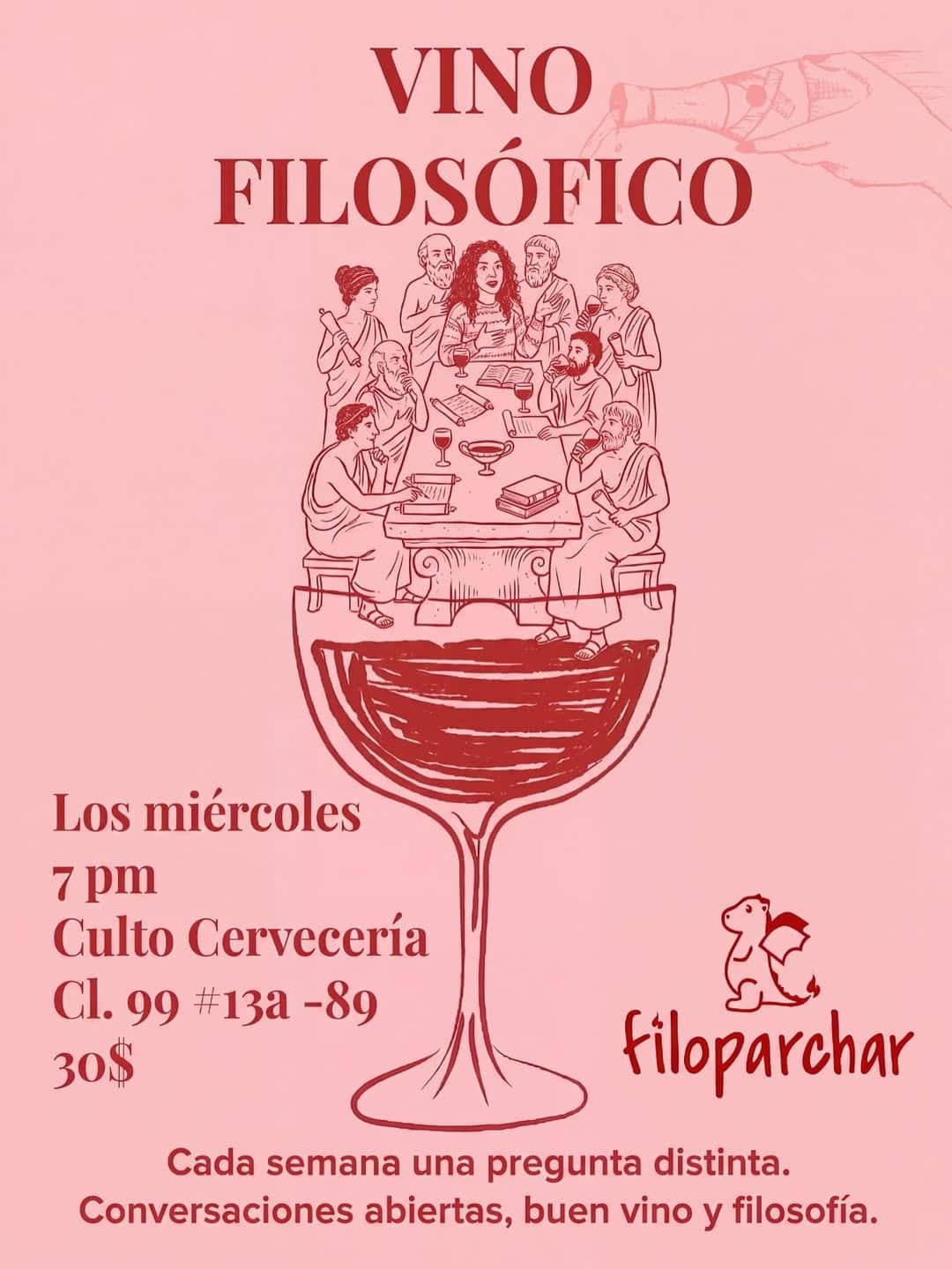Vino Filosófico es una tertulia semanal que se lleva a cabo cada miércoles en Culto Cervecería. Este evento es un espacio abierto para todo tipo de público, especialmente para aquellos que no son filósofos. Cada semana se dialoga sobre un tema diferente en un ambiente no académico, diseñado para que todos se sientan cómodos y puedan participar. ¡Anímate y ven a filoparchar con nosotros!
